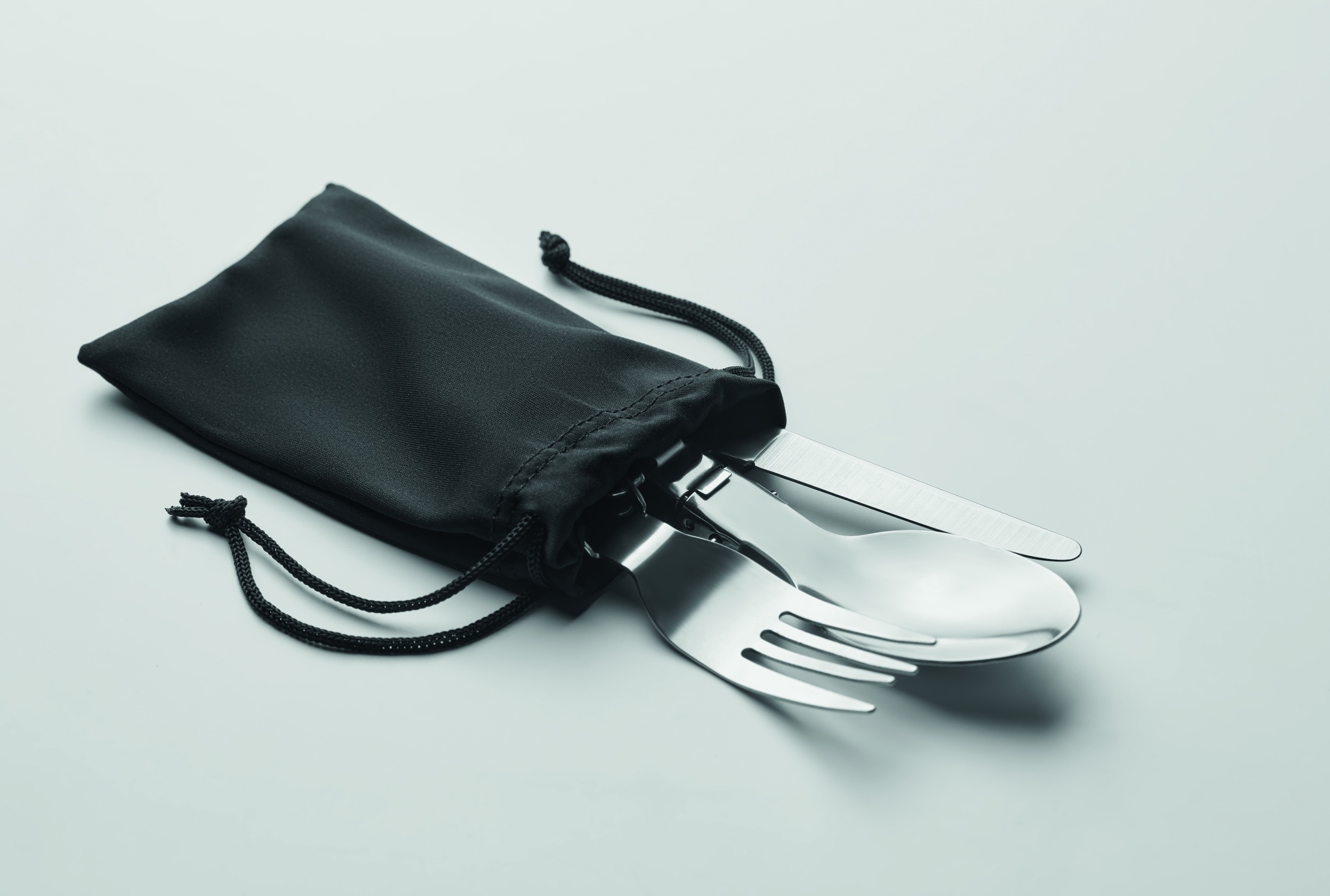 Klappbares 3teiliges Campingbesteck aus Edelstahl. Bestehend aus Messer, Gabel und Löffel. Verpackt im RPET-Beutel.