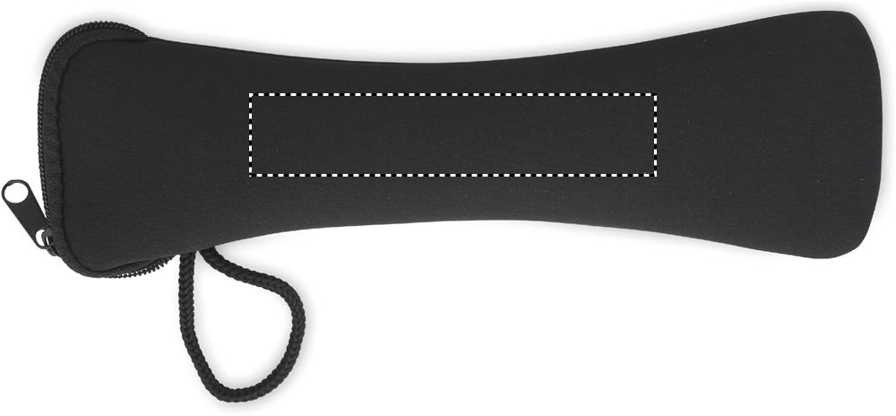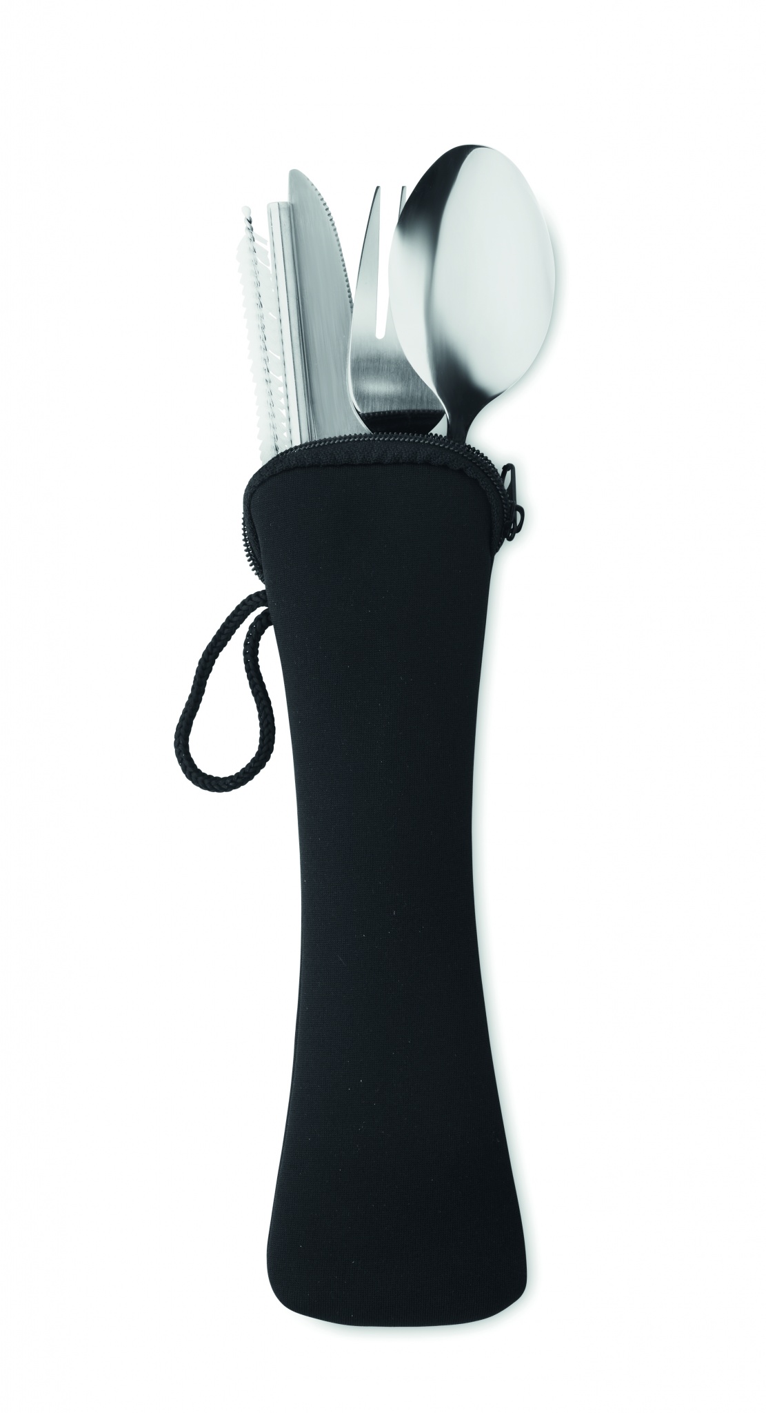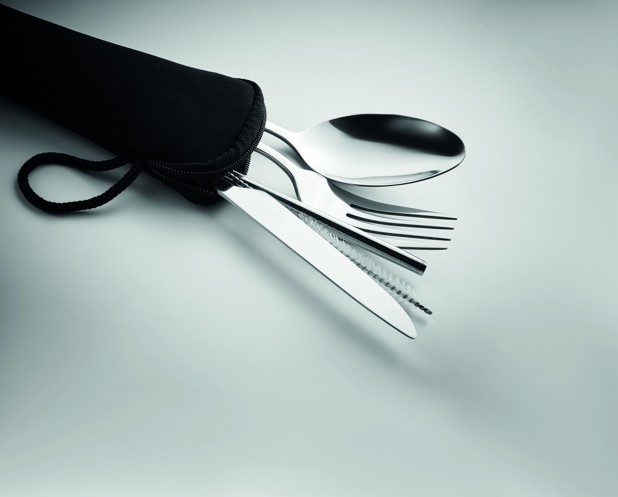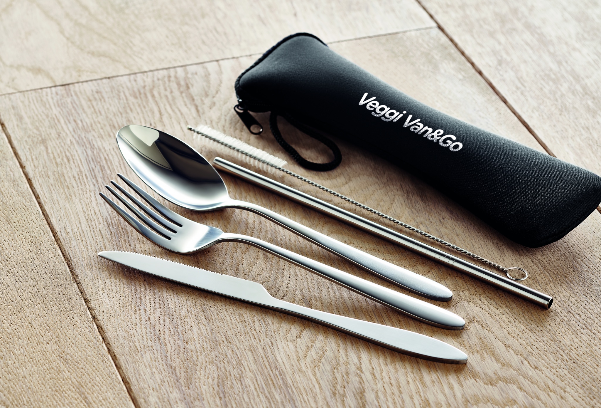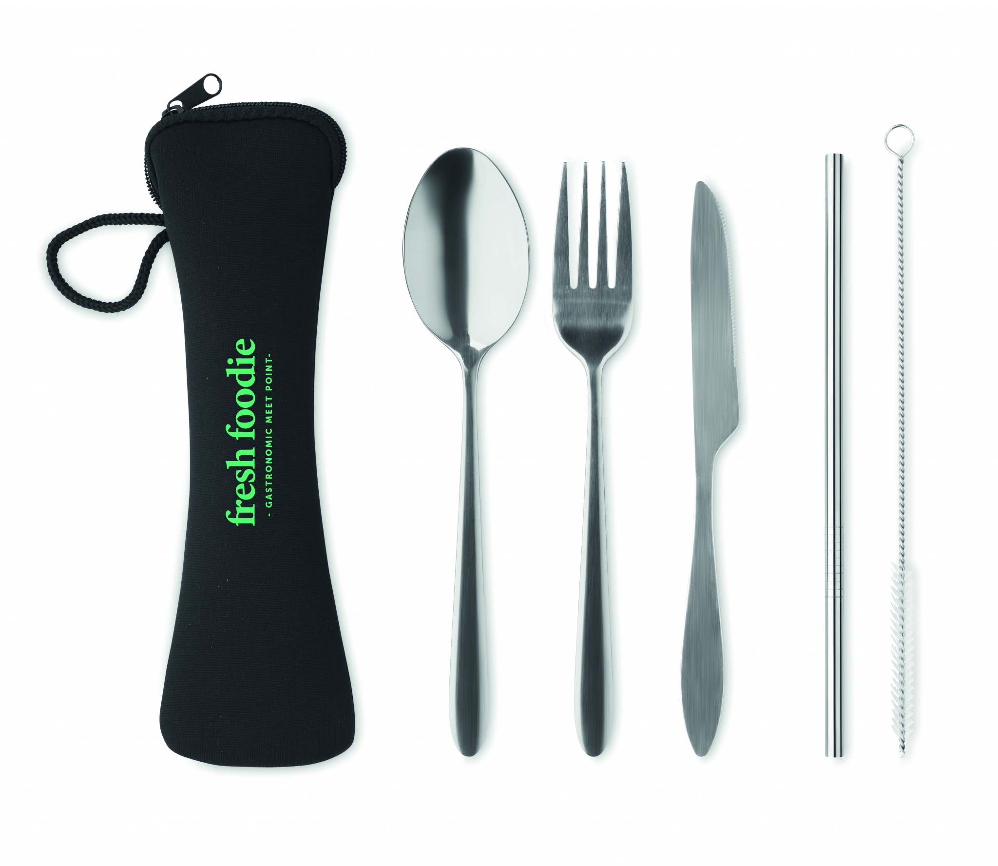 Wiederverwendbares Besteck-Set mit Messer, Gabel, Löffel, Trinkhalm und Bürste aus Edelstahl im Neopren-Beutel.