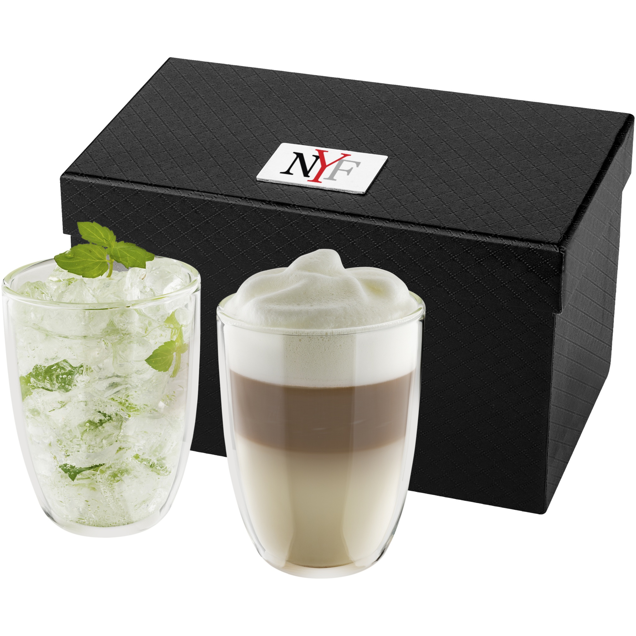 Doppelwandiges, isoliertes 290 ml Glasset. Hitzeresistentes hochwertiges Borosilikatglas. Ideal für das Servieren Ihres bevorzugten Latte Macchiato, Eistees oder anderer Heiß- oder Kaltgetränke. In einem Luxus Geschenkkarton verpackt. Mit Logoplatte.
