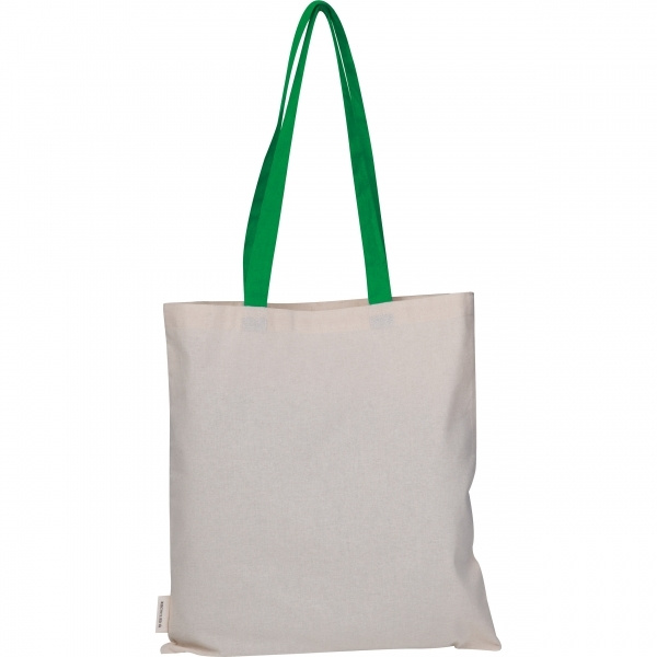 Baumwolltasche mit zwei langen Henkeln aus 75% recycelter Baumwolle und 25% recyceltem PET. Stoffgewicht: 140 g/m². Ihr Logo wird auf einer Seite der Tasche aufgebracht.