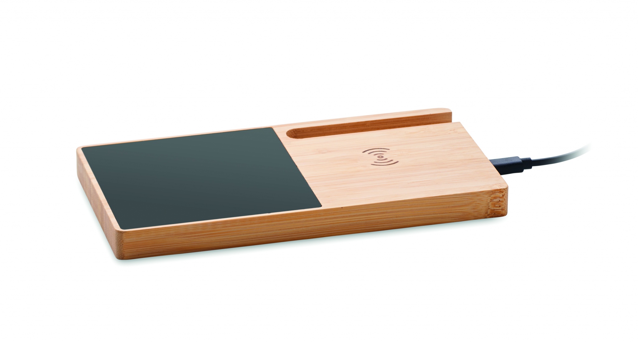 Kabellose Ladestation mit Tassenwärmer und Smartphone-Halter. Bambus. Verbinden Sie das Gerät mit dem Computer und laden Sie Ihr Smartphone durch einfaches Auflegen auf. Ausgang: DC 9V/1.67A (15W). Kompatibel mit allen QI-fähigen Geräten wie den neuesten Android Smartphones, iPhone® 8 und X und höher.