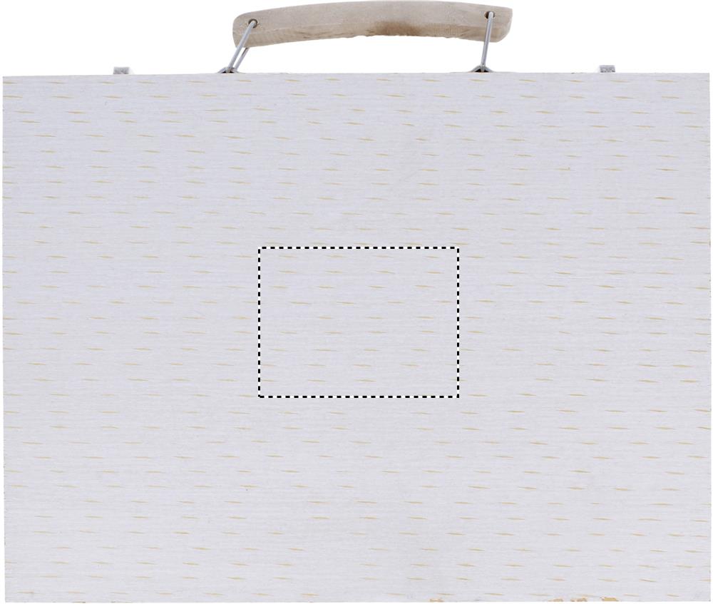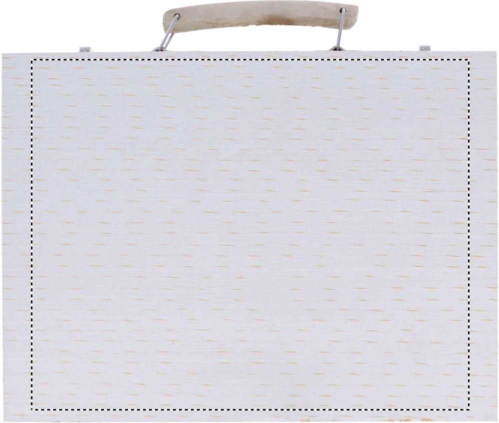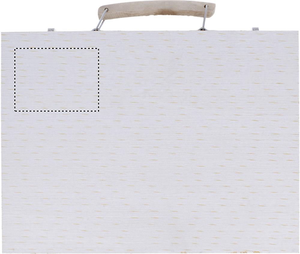 Malkoffer aus Holz: bestehend aus 12 Filzstiften, 12 Buntstiften, 12 Wachsstiften, 12 Pastellfarben, 1 Radiergummi, 1 Lineal, 1 Anspitzer, 1 Tube Kleber, 12 Wasserfarben und 1 Pinsel.