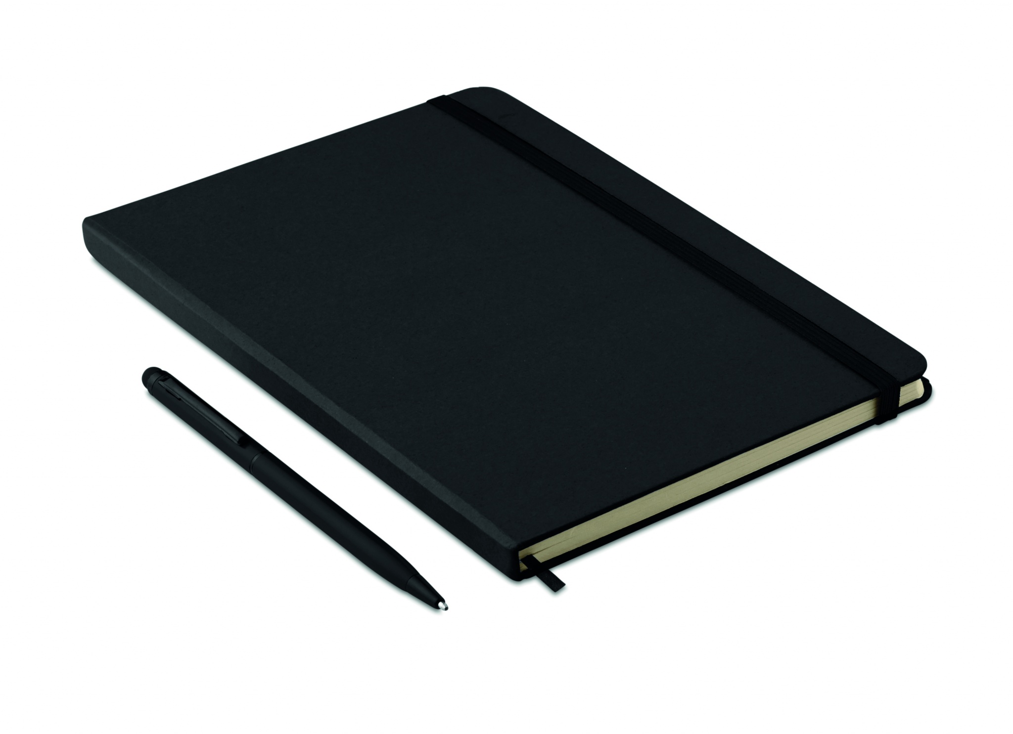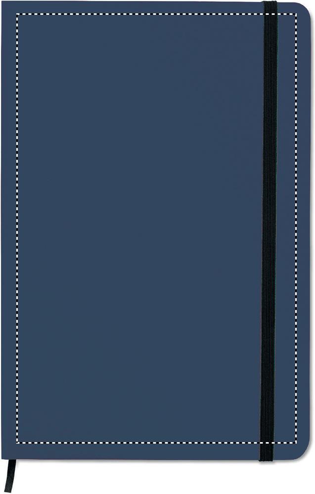 DIN A5 Notizbuch mit Hard Cover aus PU. 72 Blatt (144 Seiten) liniertes Papier. Farblich abgestimmter Kugelschreiber mit Stylus. Blaue Tinte. Elastisches Verschlussband, Lesebändchen und Stiftschlaufe.