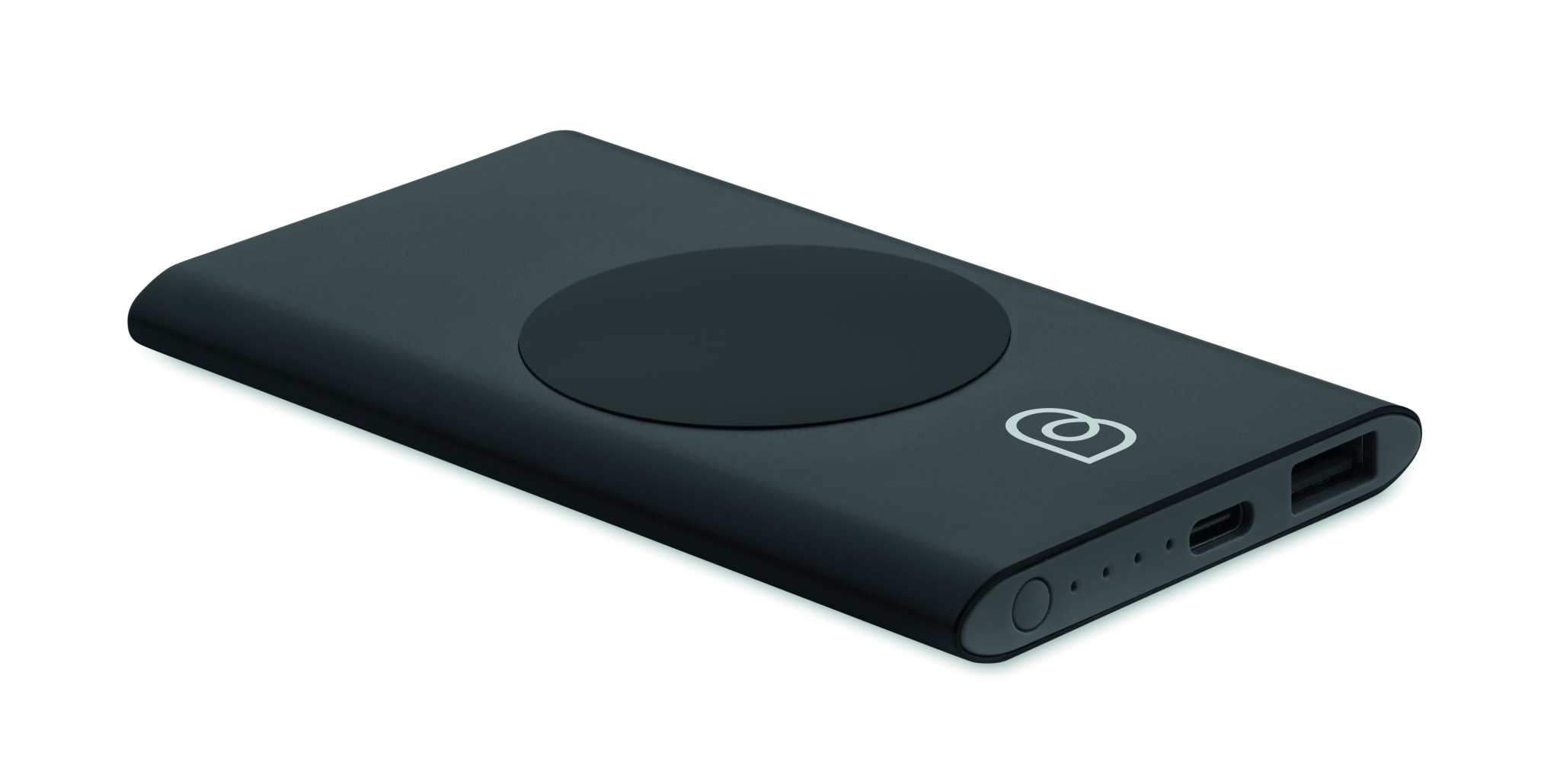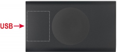 Powerbank 5000 mAh mit kabelloser Ladestation 15W aus recyceltem Aluminium. Eingang: Typ-C. Ausgang: 1 x Typ-C & 1 x Typ-A. Ausgangsstrom DC5V/2A. Kompatibel mit den neuesten Androiden, iPhone® 8, 8S und X und neueren Modellen.