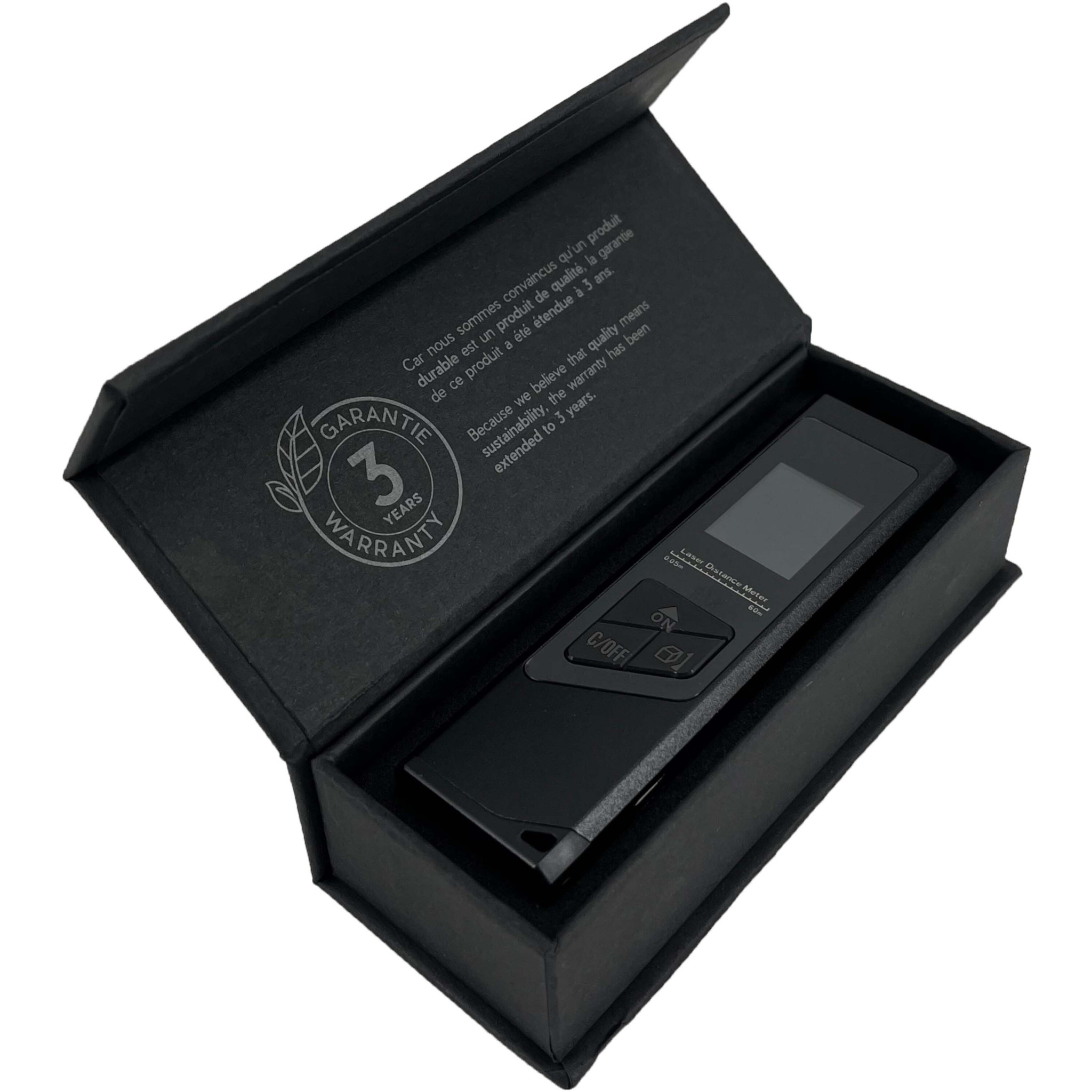 Der Mini-Laserentfernungsmesser bietet eine einfachere, schnellere und genauere Möglichkeit zur Messung von Flächen und Volumina und verfügt außerdem über eine Pythagoras-Funktion. Mit seiner Laser-Präzisionstechnologie und dem Echtzeit-Messmodus liefert er zuverlässige Messungen bis zu 40 Metern. Der Entfernungsmesser verwendet einen energiesparenden 200 mAh Li-Ionen-Akku als Stromversorgung und kann nach einer vollen Aufladung 2000 Entfernungen messen. Das Display ist hintergrundbeleuchtet, sodass Sie es auch in dunklen Umgebungen leicht ablesen können. Größe 9 × 2,4 × 1,1 cm. Verpackt in einer Geschenkbox aus recyceltem Papier (10,2 × 4,2 × 3 cm) mit Magnetverschluss. Inklusive 3 Jahre Garantie.