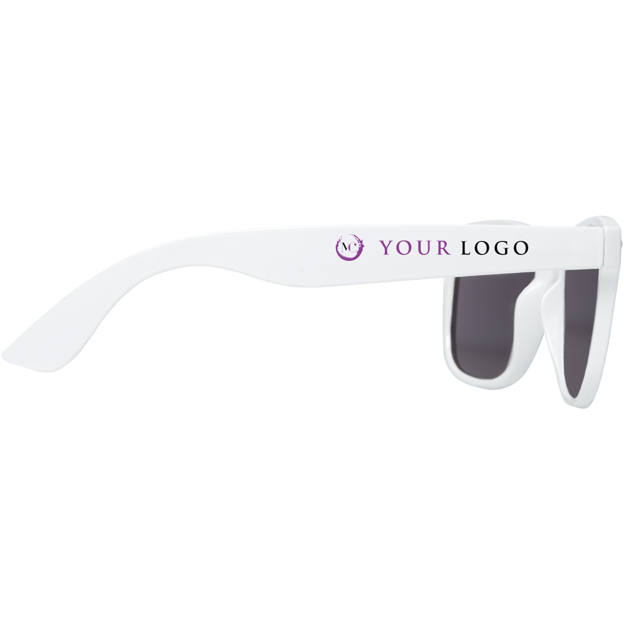 Diese nachhaltige Sonnenbrille im Retro-Design ist der ideale Werbeartikel für Sommerfestivals, Veranstaltungen oder andere sonnige Aktivitäten im Freien. Dank des recycelten PET-Kunststoffs ist die Sonnenbrille leicht und angenehm zu tragen. Diese Brille entspricht der Norm EN ISO 12312-1, hat UV400-Gläser der Kategorie 3 und ist somit die perfekte Wahl für den Schutz vor hellem Sonnenlicht.