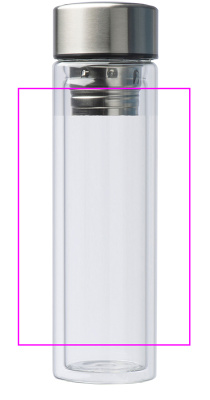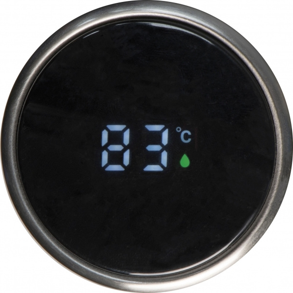Thermoskanne aus Borosilikatglas mit digitaler Temperaturanzeige im Deckel, Sieb und einem Fassungsvermögen von 400 ml. Ihre Werbung wird auf das Glas gedruckt.