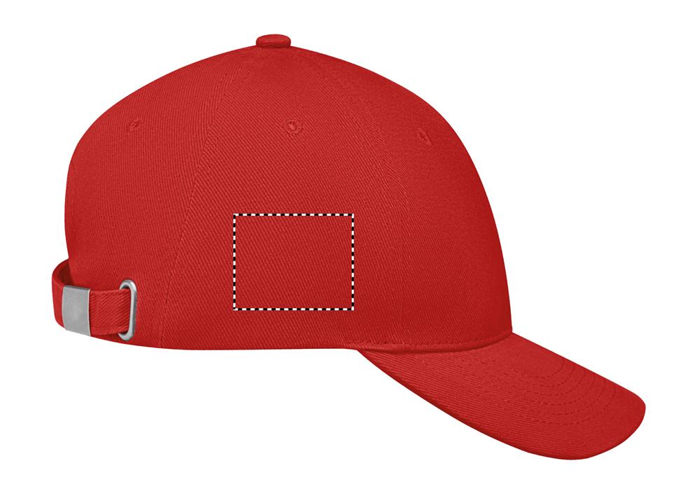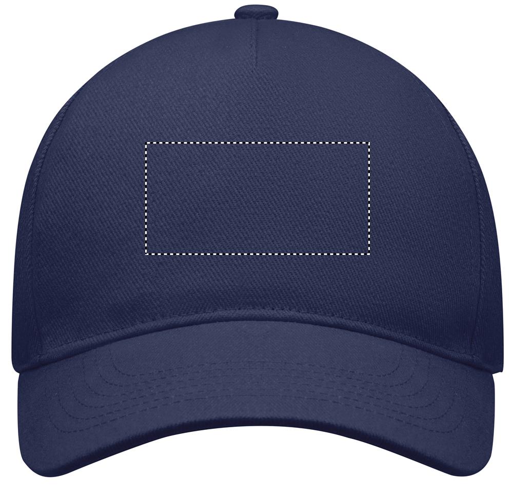 5 panel baseball cap in heavy brushed twill cotton 260 gm/m2 with silver steel buckle. 4 embroidered eyelets in matching colour. Size 7 1/4.