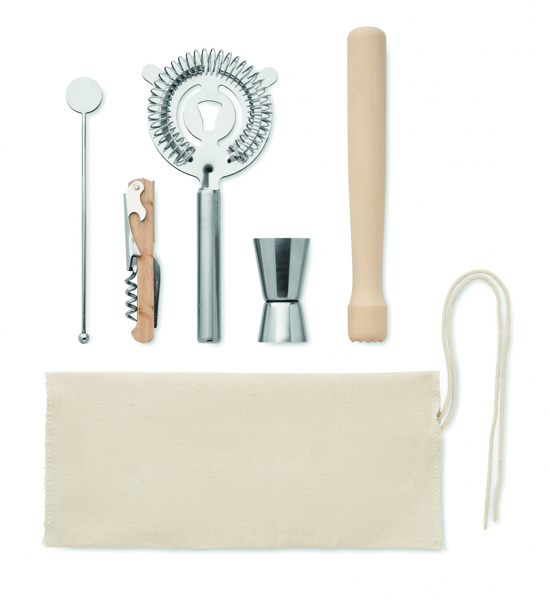 Cocktail kit in cotton pouch with string. Including 5 piece: a double-sided measuring jigger (15 & 30 ml), wooden muddler, cocktail strainer, drink stirrer and waiter's corkscrew knife.