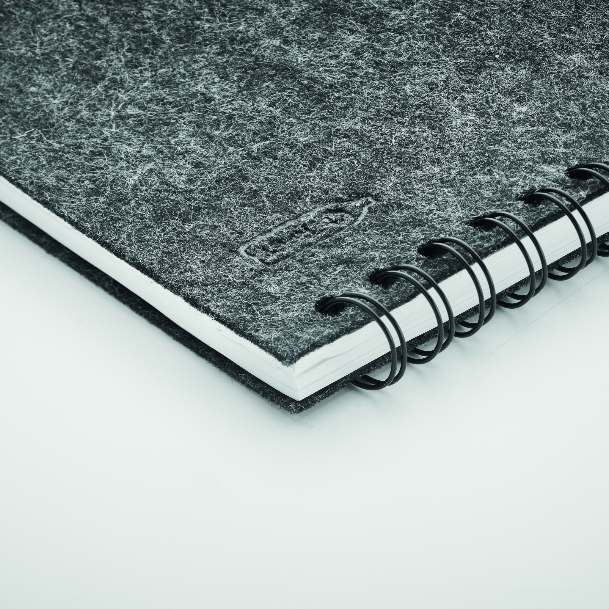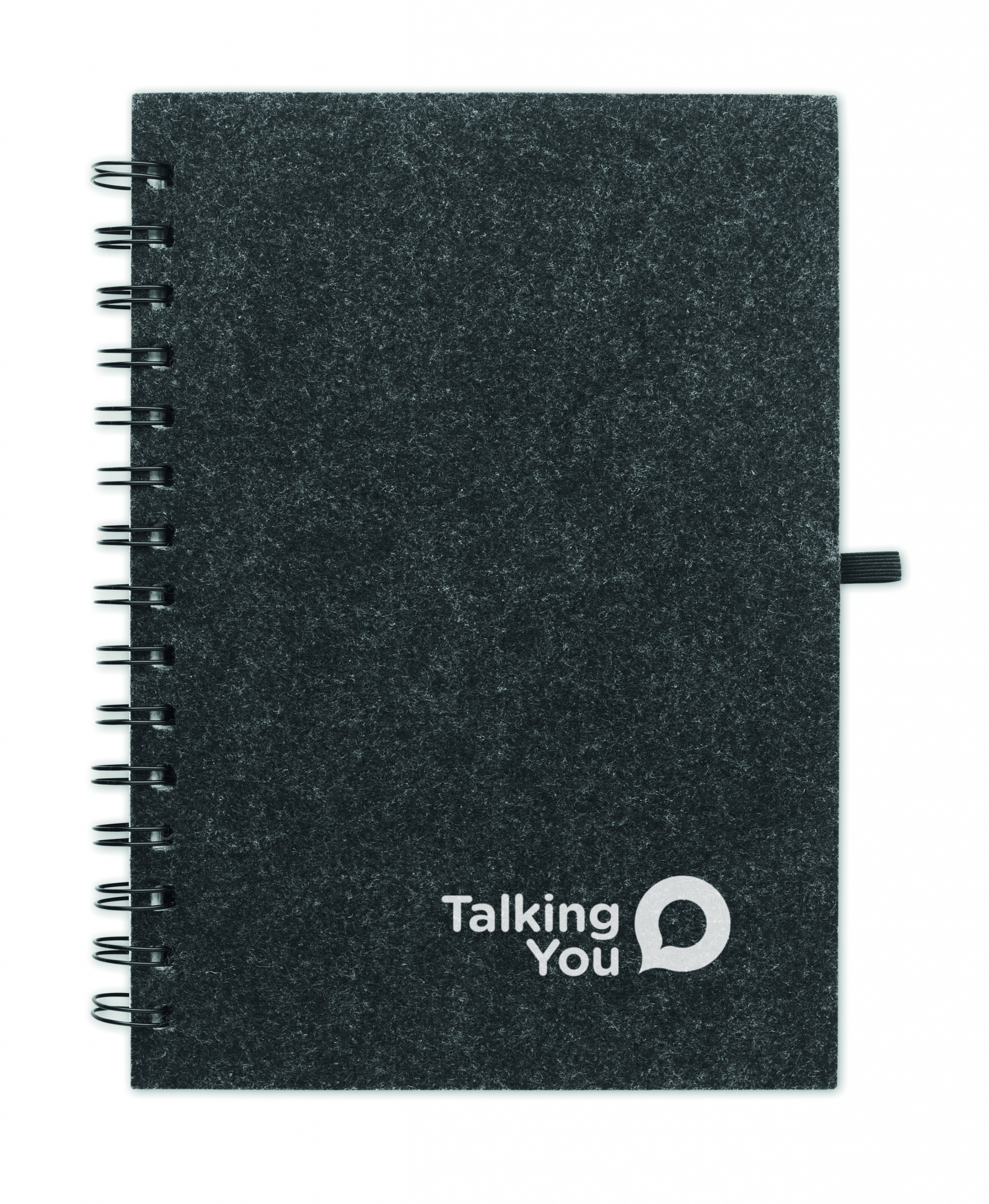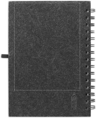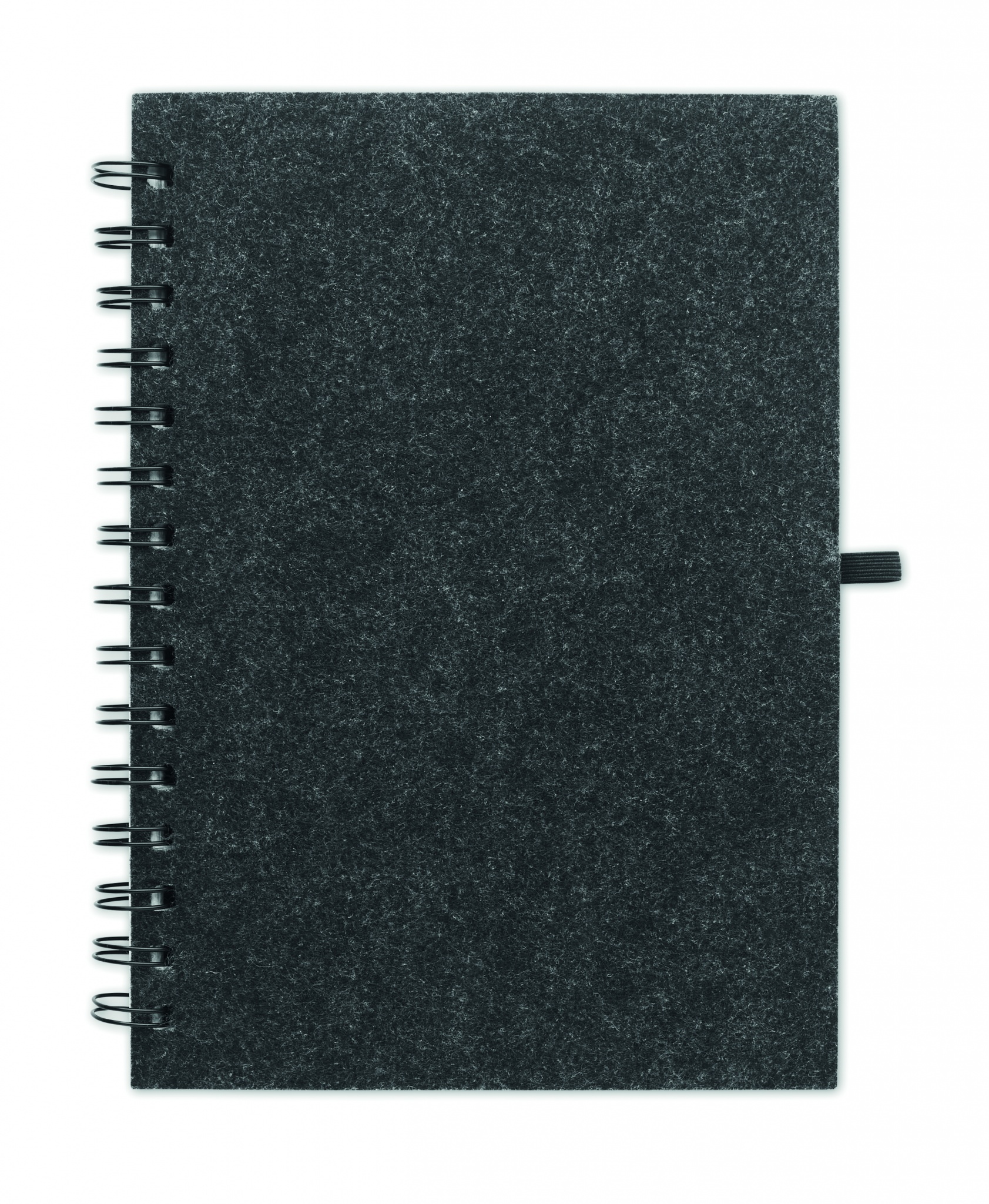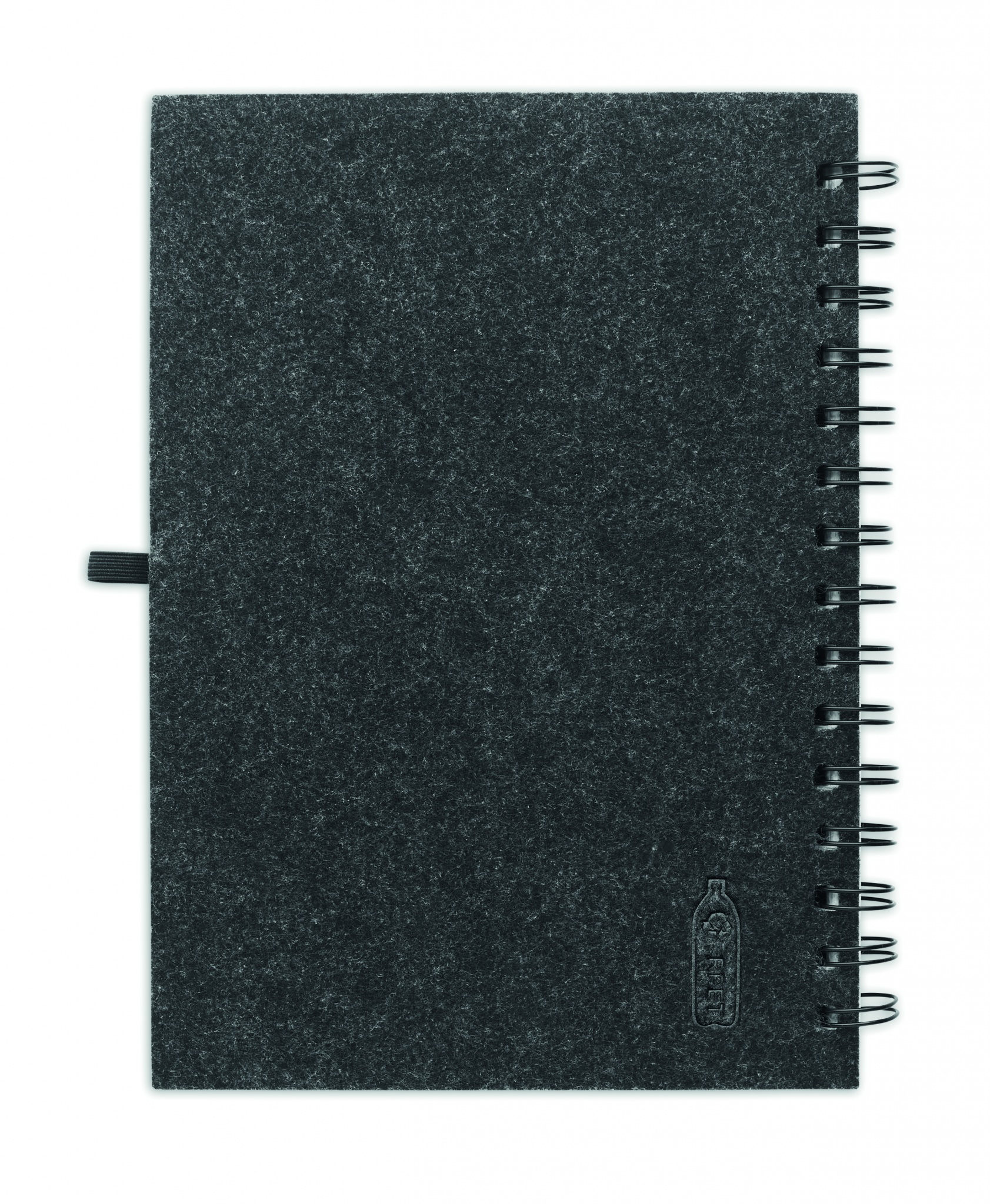 A5 RPET felt cover notebook. Twin-wire bound, 160 recycled lined pages in 70 gr/m² (80 sheets) with elastic pen holder.