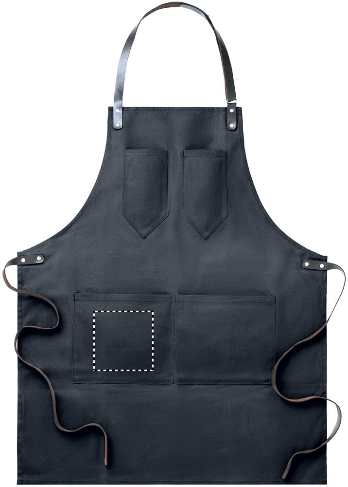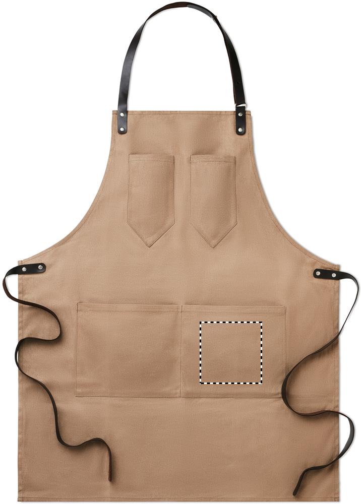 Apron in waxed canvas with leather details, adjustable strap with 2 chest pockets and 1 large low level pocket. 12oz Waxed Canvas.
