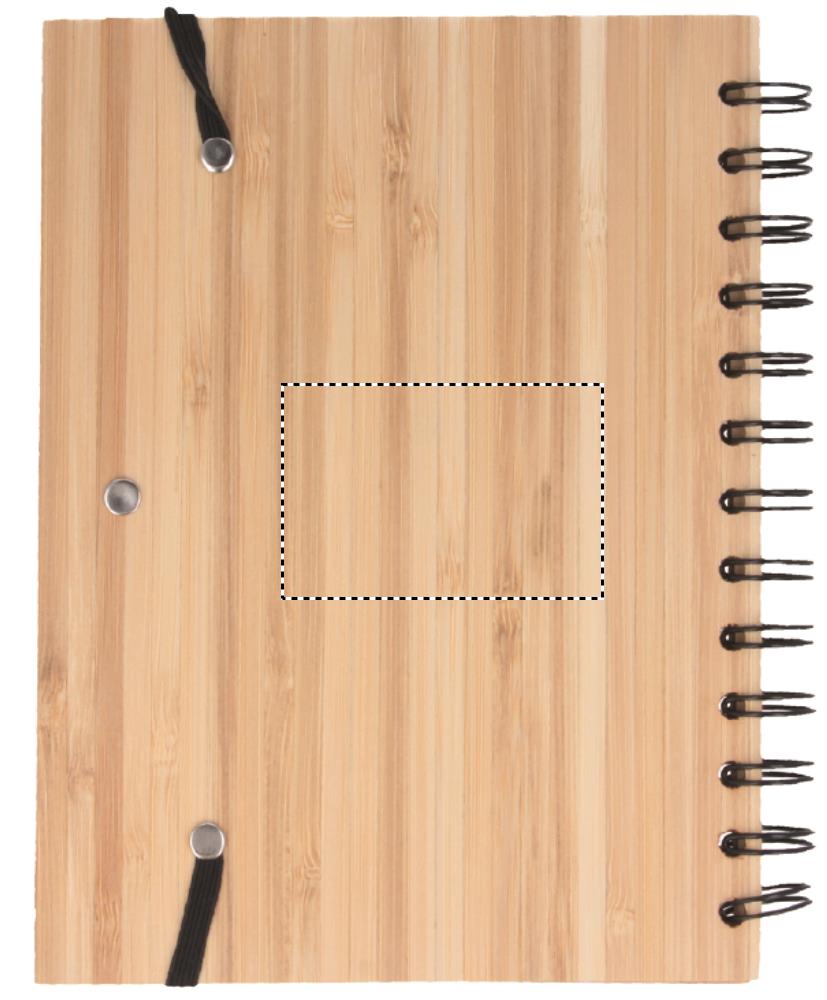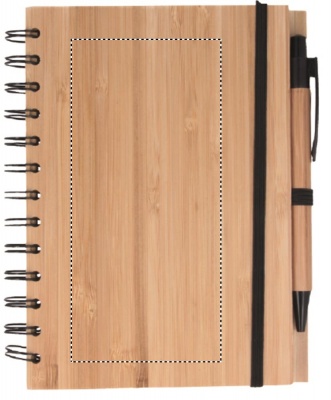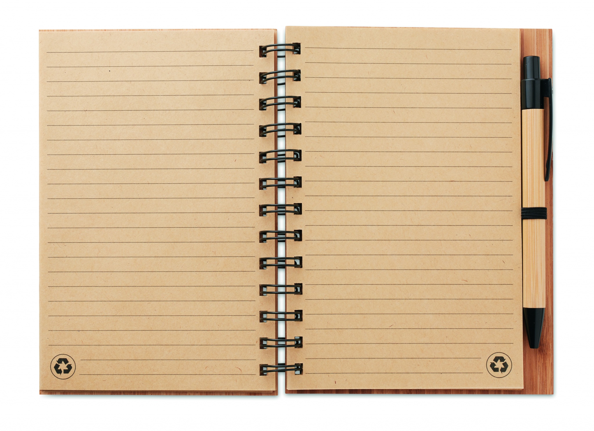 Bamboo cover notebook with matching pen. Twin-wire. 140 lined recycled paper pages (70 sheets). Matching push button ball pen with bamboo barrel and ABS details. Elastic pen holder. Bamboo is a natural product, there may be slight variations in colour and size per item, which can affect the final decoration outcome.