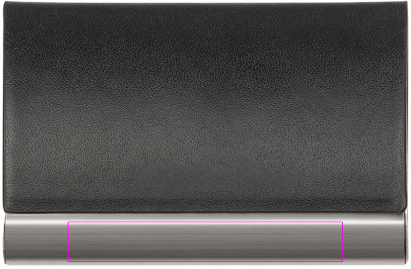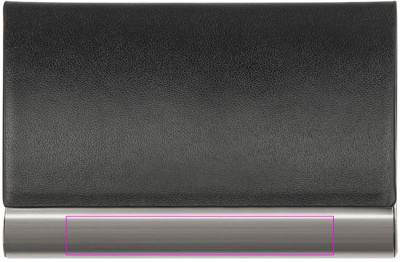 Business card holder made of metal with leatherette cover and magnetic closure. The logo is lasered onto the metal strip.
