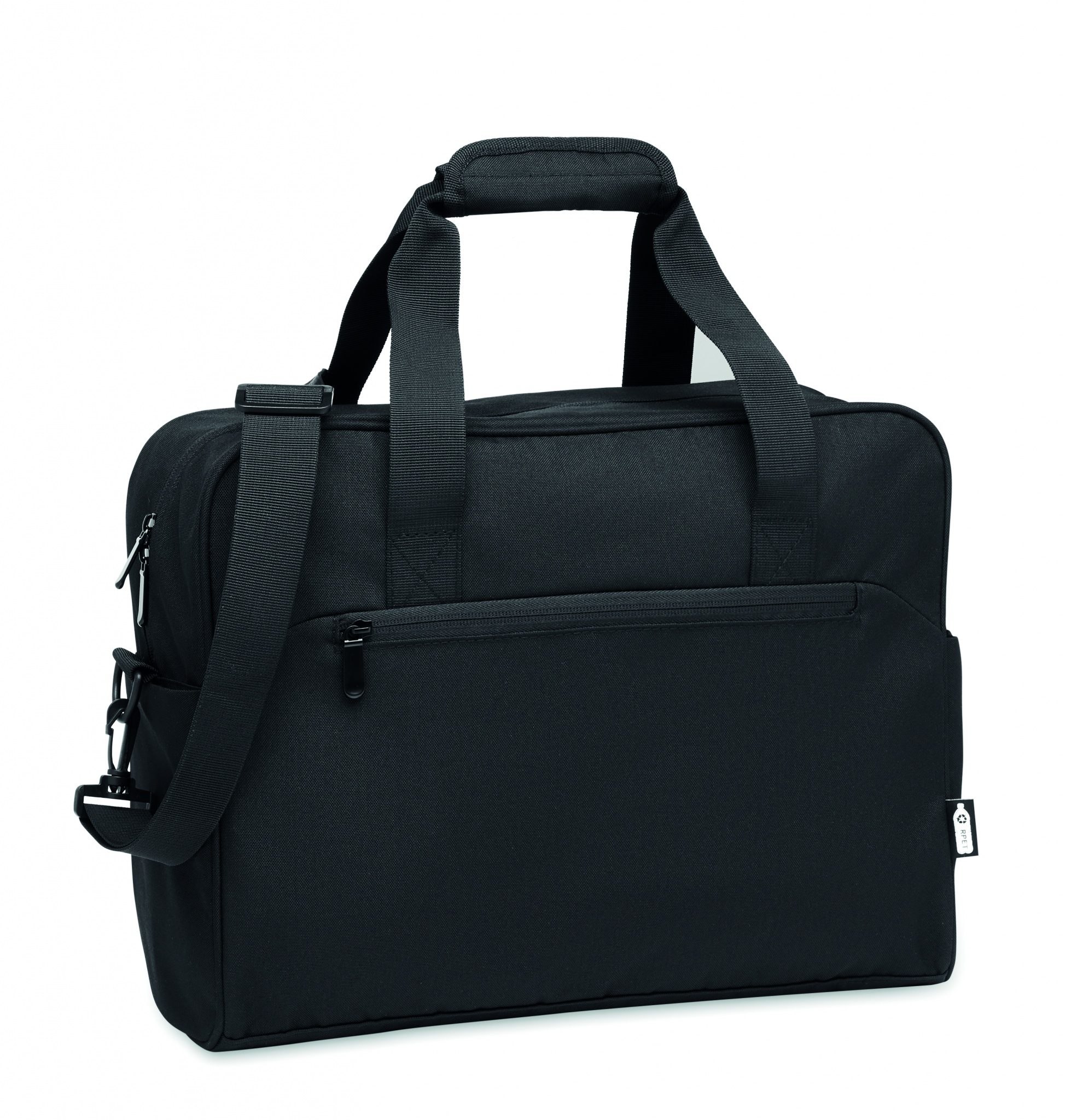 Carry-on hand luggage travel bag in 600D RPET with large zippered front pocket, two small side pockets. Includes 15 inch laptop compartment. Padded removable and adjustable shoulder strap. Trolley holder on reverse side.