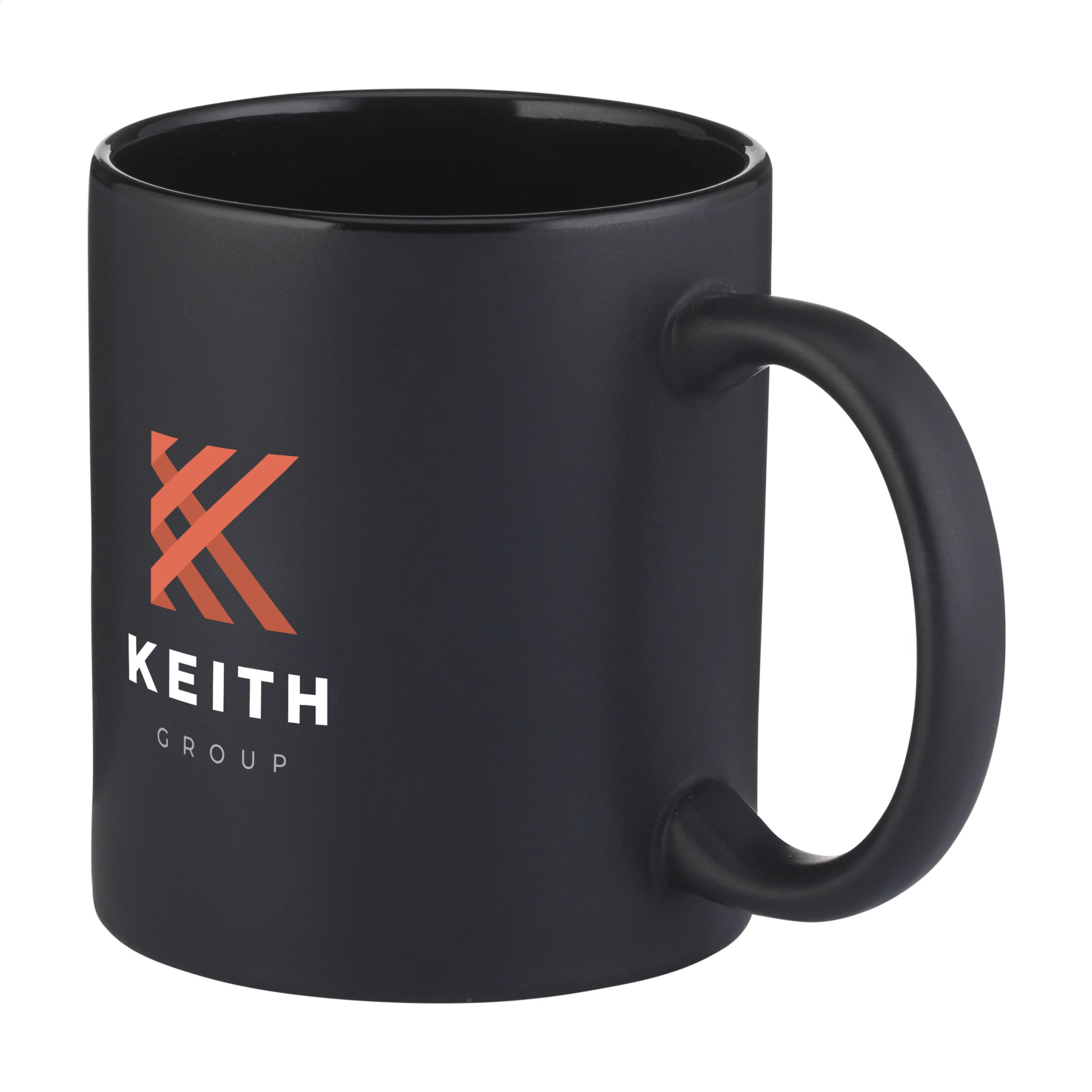 High quality ceramic mug with a matt black exterior and a glossy black interior. Dishwasher safe. The imprint is dishwasher tested and certified: EN 12875-2. Capacity 350 ml.