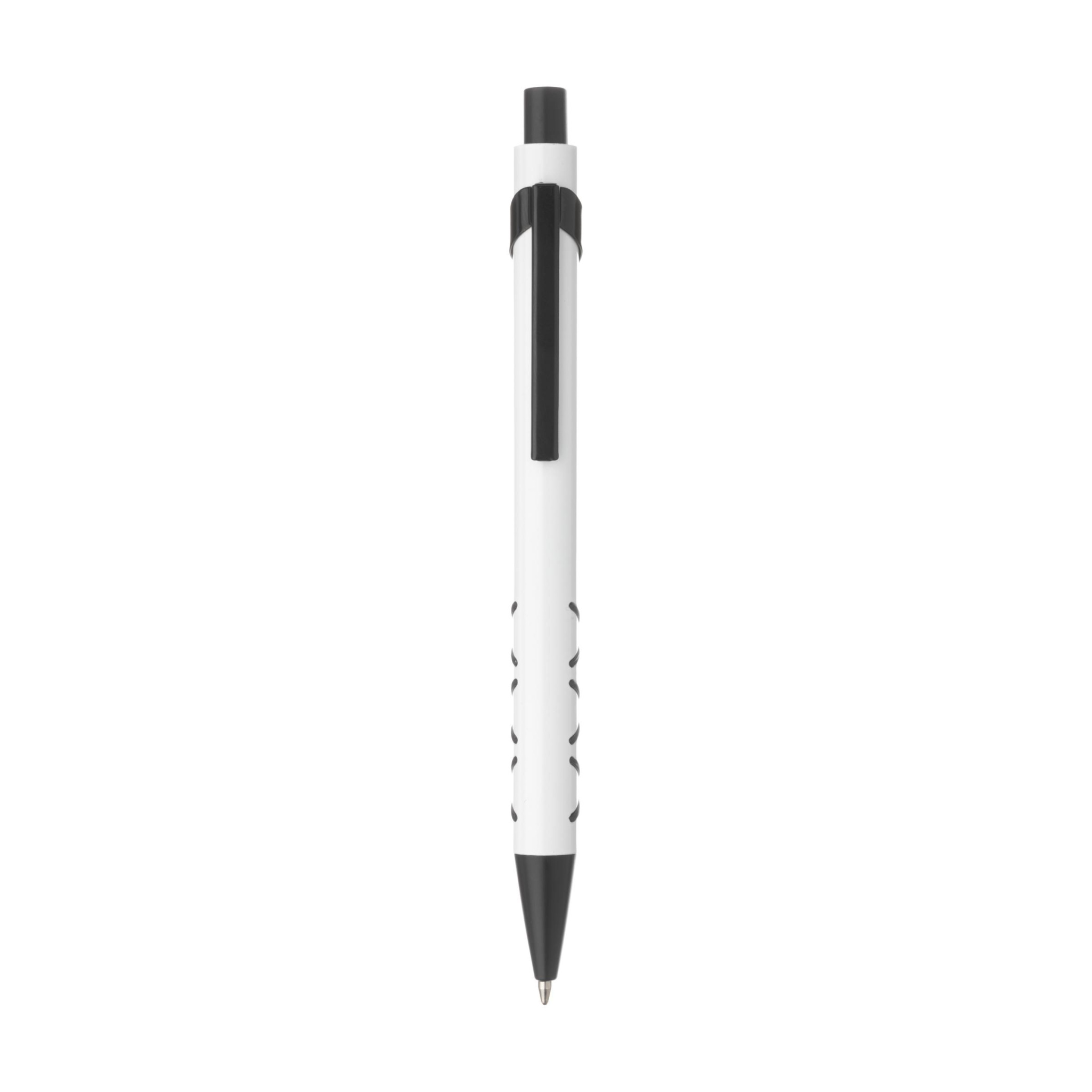 Blue ink, aluminium ballpoint pen with grippy, rubber accents on the barrel, matte metallic look and metal clip.