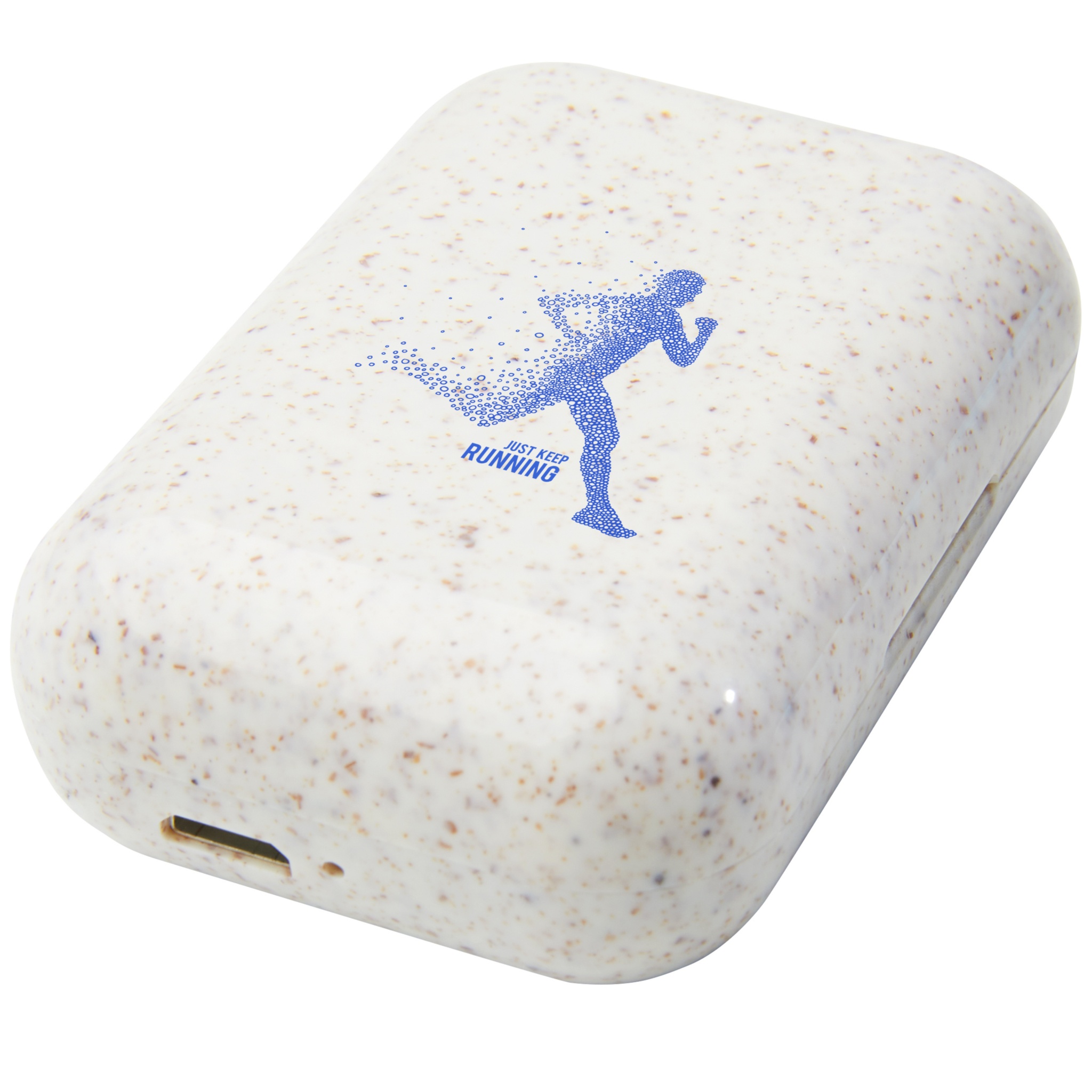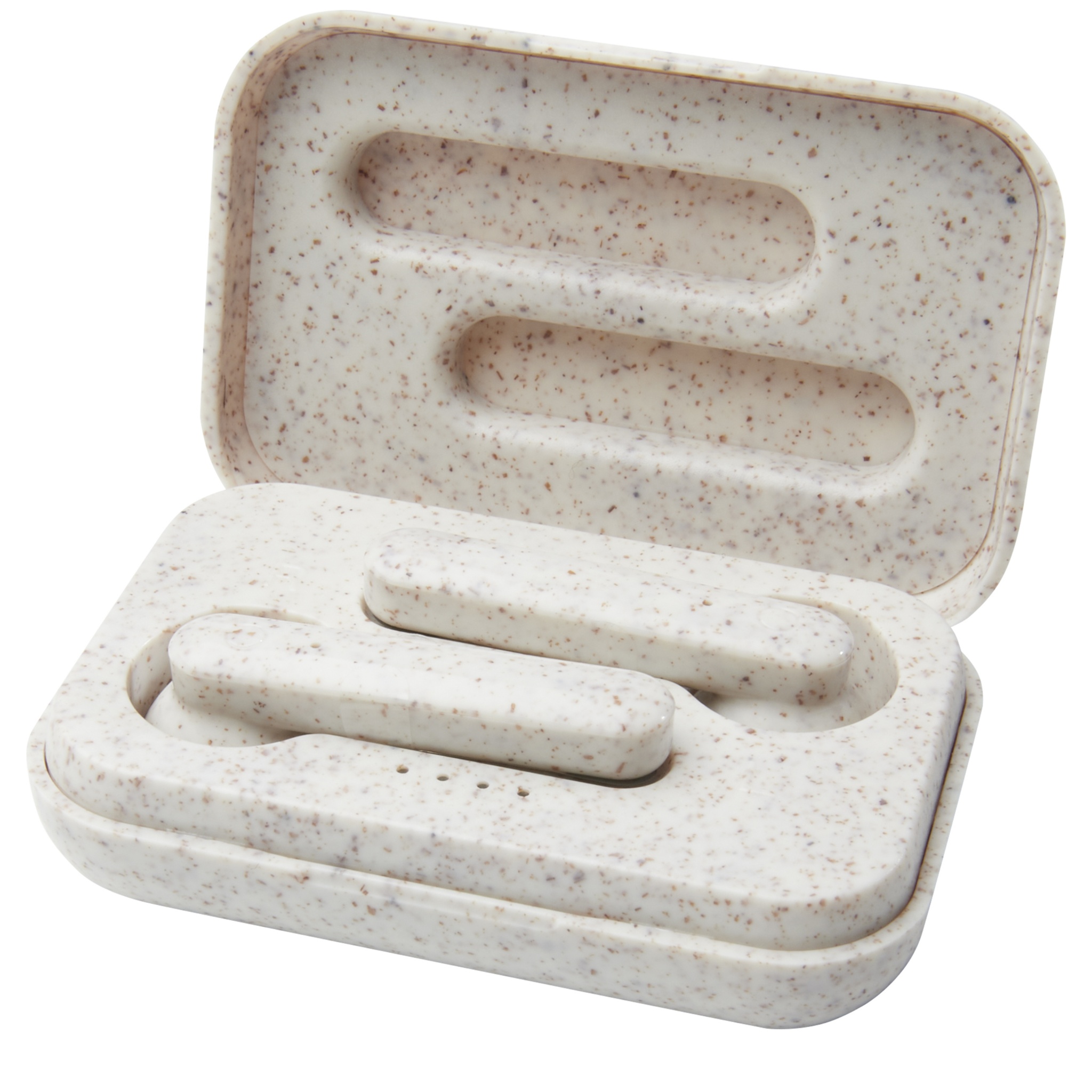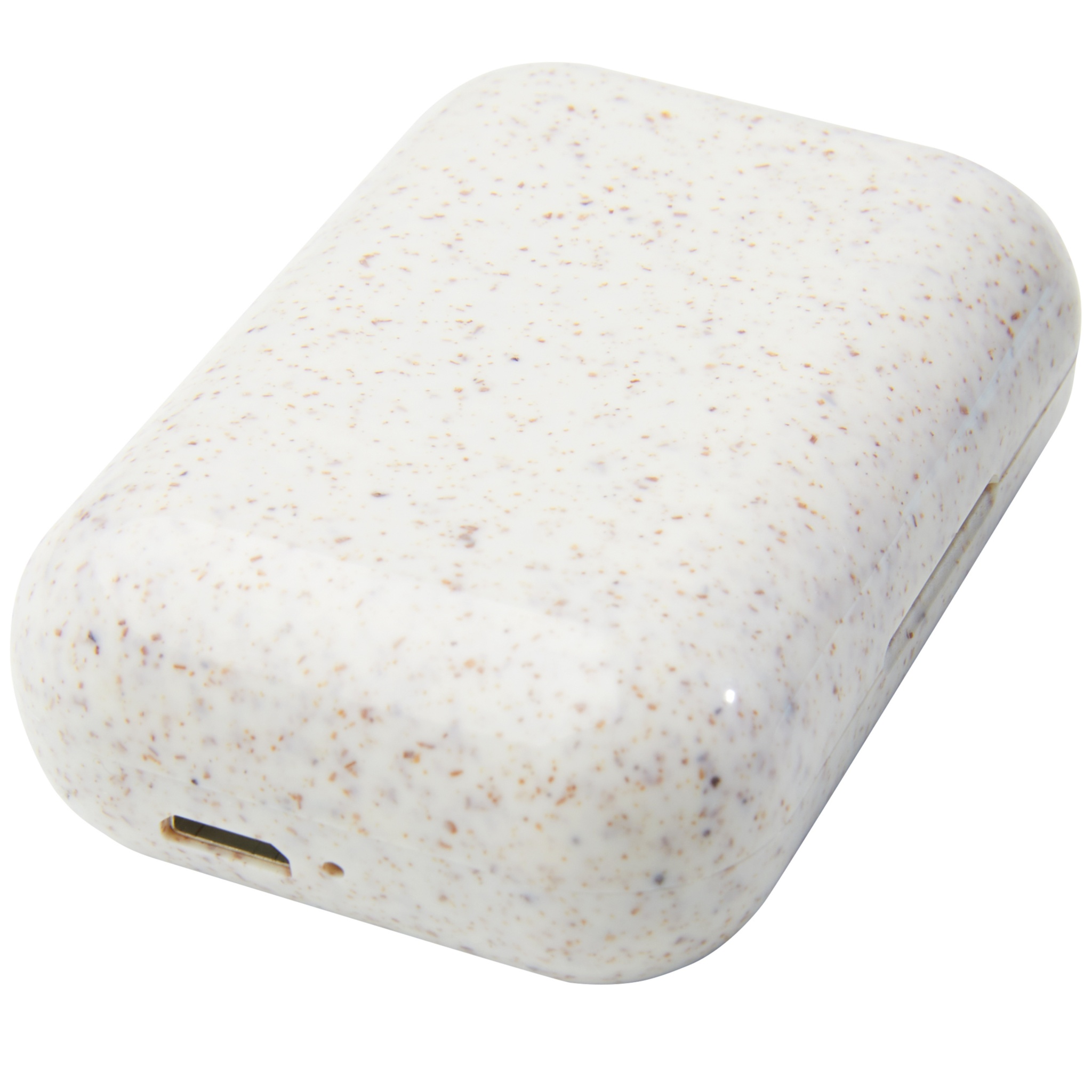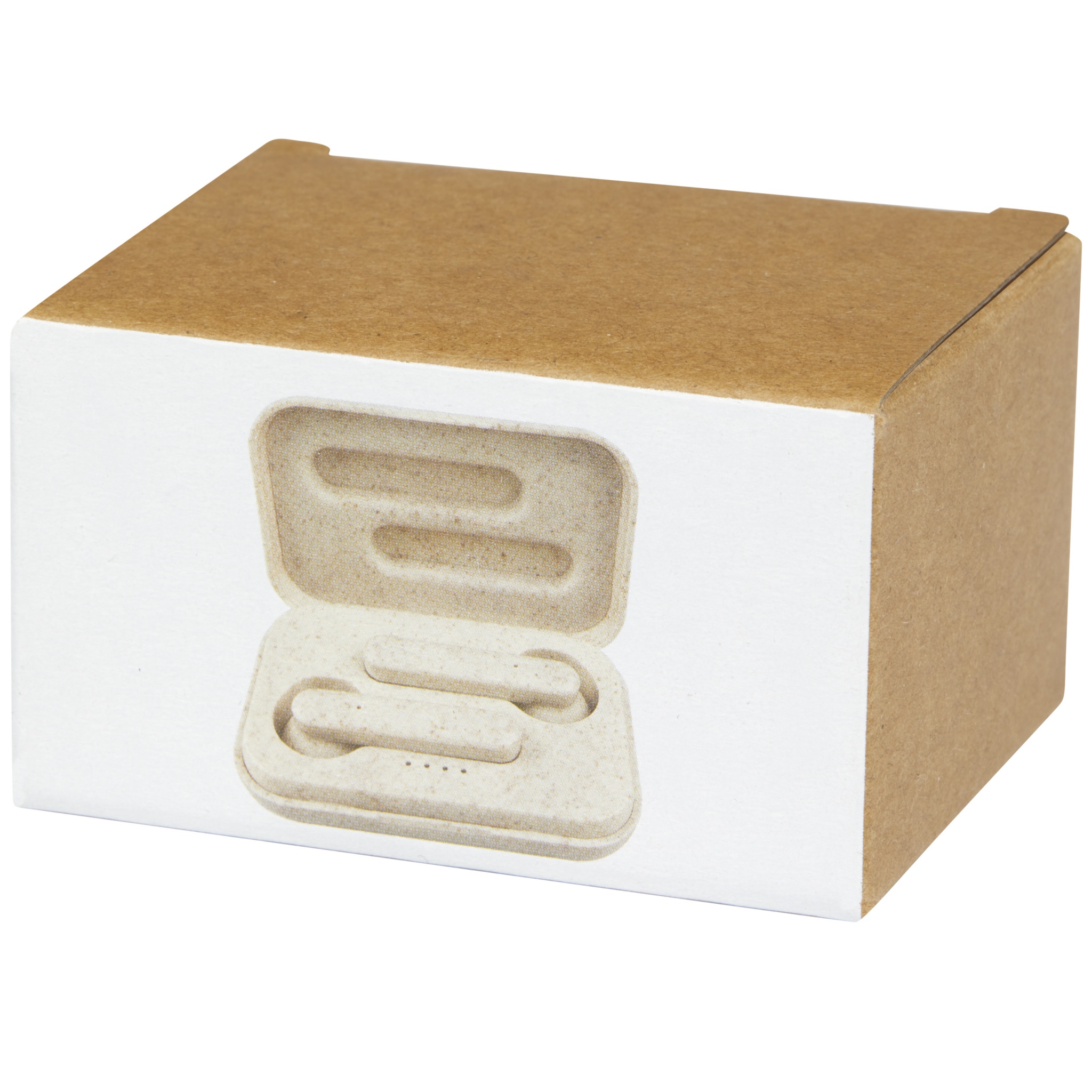 True Wireless stereo earbuds made of a wheat straw plastic mix, reducing the amount of plastic needed. Built-in multi-function button to control all functions: Power on/off, answer/hang up, play, pause, next/previous song, volume up/down, activate voice assistant. Bluetooth® 5.0 with a range up to 10 meters. The power capsule can charge the earbuds from 0 to 100% at least 3 times. Playback time is up to 2 hours at max volume and the earbuds can be fully charged in 1 hour. Delivered in gift box with an instruction manual (both made of sustainable material).