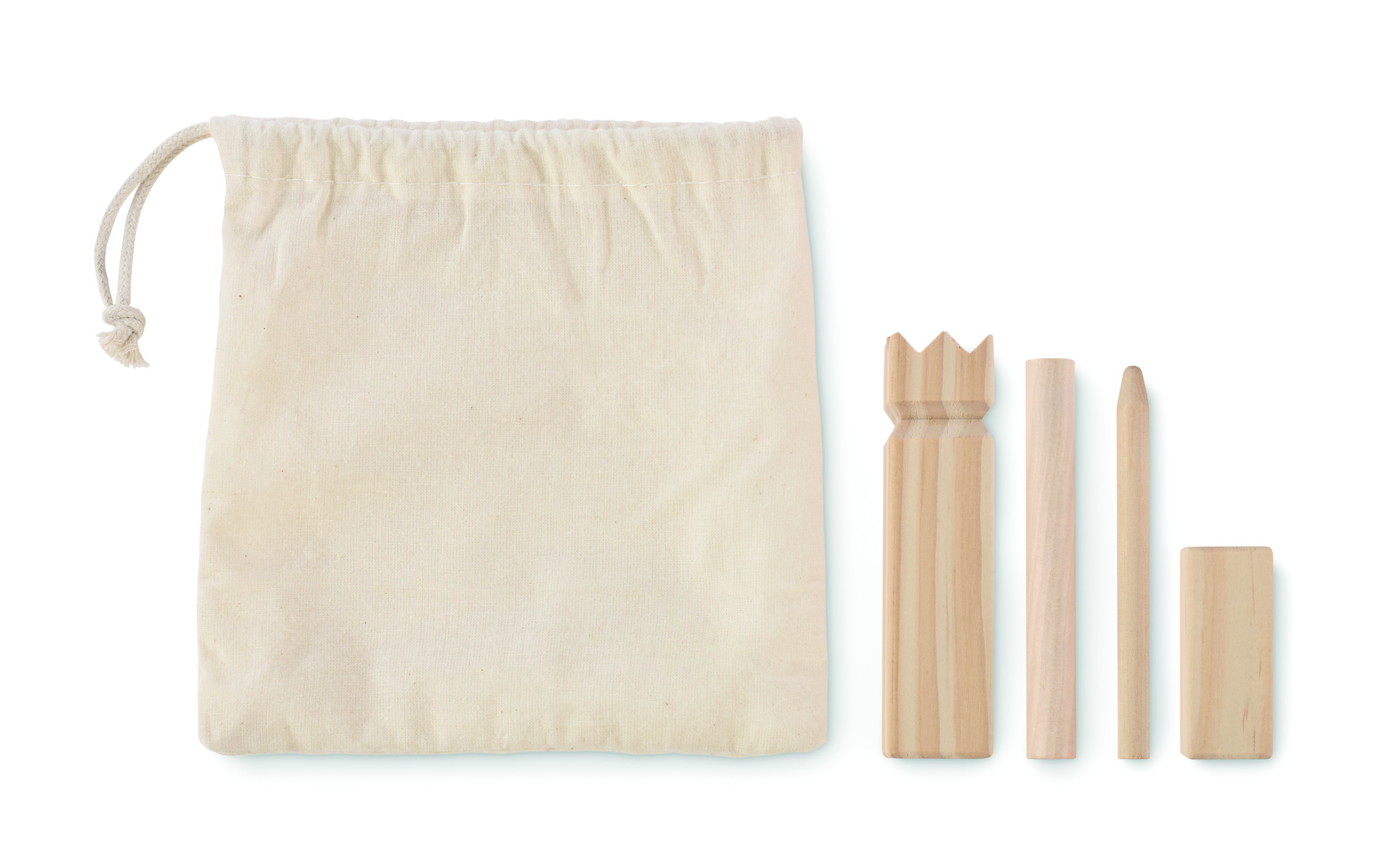 Small pine wood throwing game presented in a cotton drawcord bag.