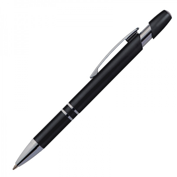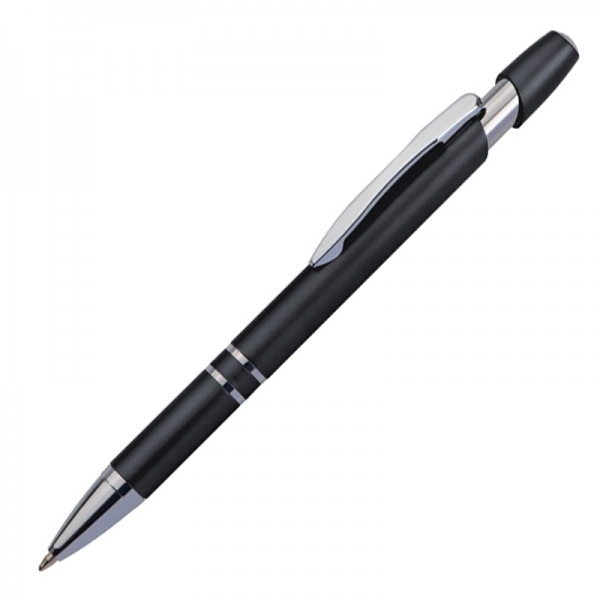 Metallic-looking plastic ballpen with large capacity refill and push function. We will print your logo below the clip.