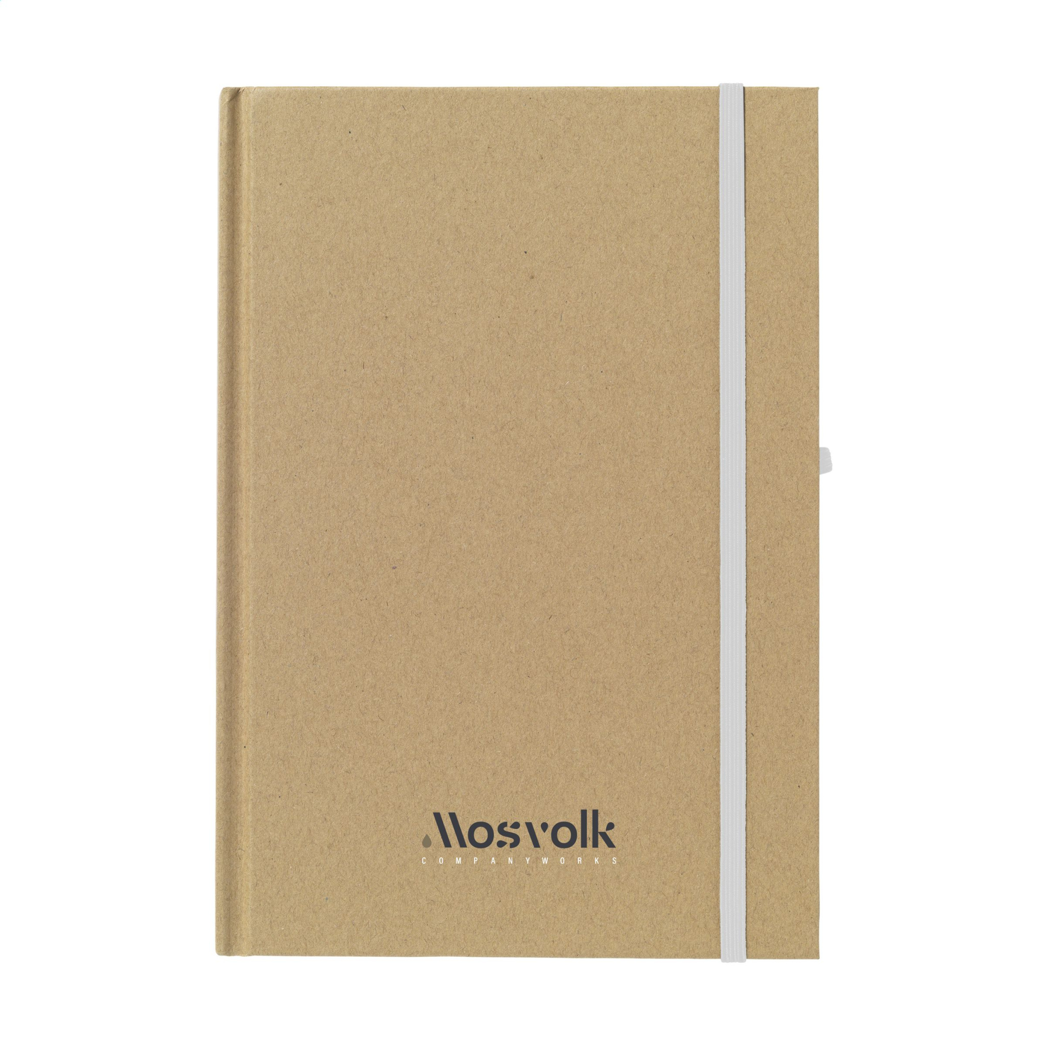 A5 size notebook made from recycled material. With approx. 80 sheets/160 pages of cream-coloured, lined paper (70 g/m²), handy pen loop and elastic closure.