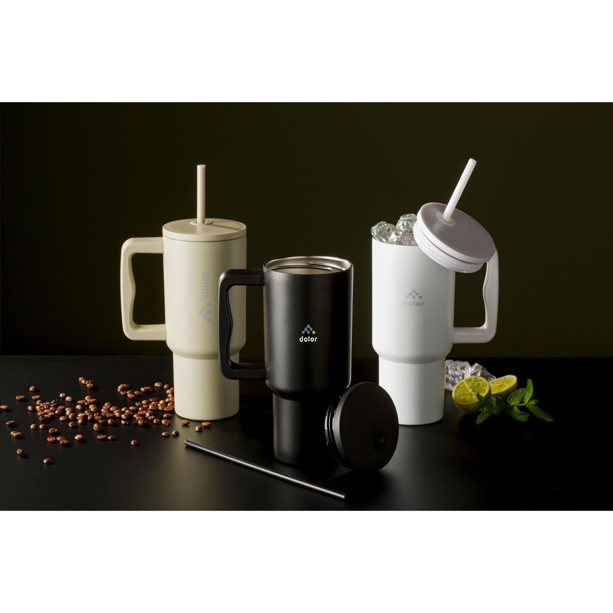 WoW! Large, double-walled drinking cup made from recycled stainless steel with straw. The striking, sturdy mug has a large, plastic handle and a screw-on lid with an opening for the included plastic straw. This huge mug keeps drinks at temperature for longer periods of time. Suitable for cold and hot drinks. Without a straw, the temperature is not lost thanks to the silicone seal in the lid. This mug can go anywhere. Ideal for the gym or the office. Thanks to the conical, narrow bottom, the cup fits in almost any cup holder, making it perfect for on the go. Not dishwasher-safe. RCS-certified. Total recycled material: 75%. Capacity 900 ml. Each item is supplied in an individual brown cardboard box.