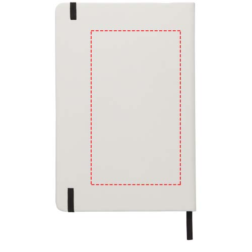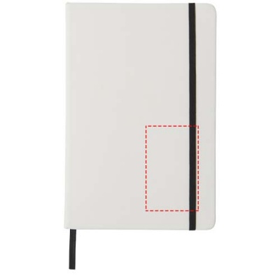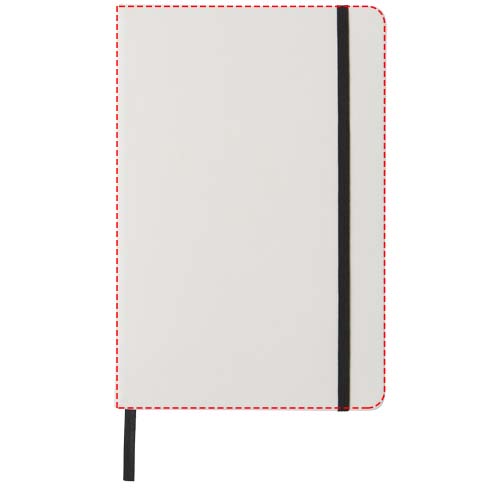 White A5 notebook with coloured elastic closure and ribbon. Includes 80 sheets (60g/m2) lined paper. Digital print possible on cover.