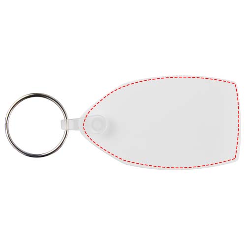 White rectangular-shaped keychain with metal split keyring. The metal looped ring offers a flat profile which is ideal for mailings.