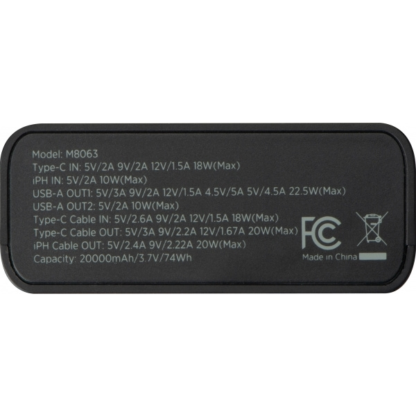Kiirlaadimisfunktsiooniga akupank, võimsus 20 000 mAh. Sellel on 2x USB port ja 2x Type C port, sisseehitatud Type C ja Lightning kaabel ning digitaalne ekraan.