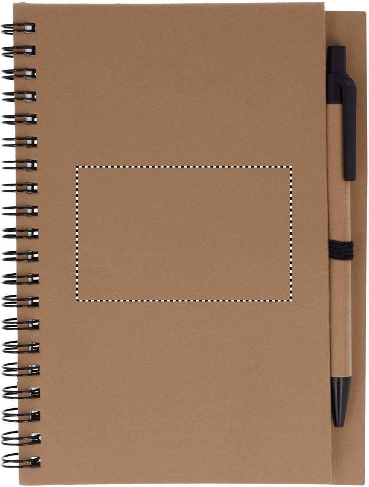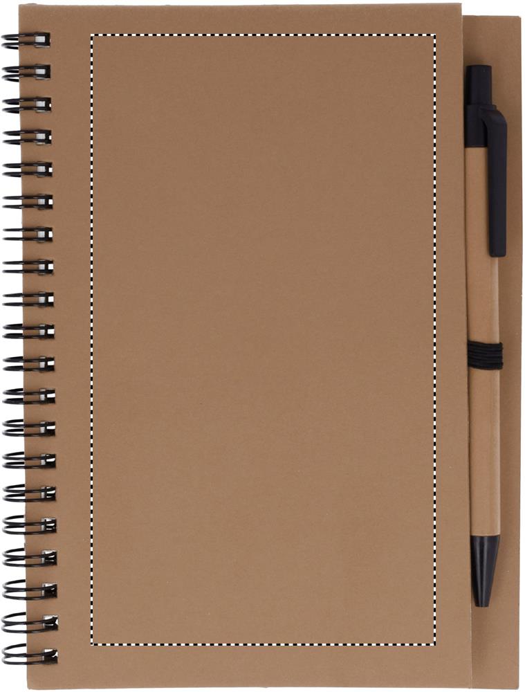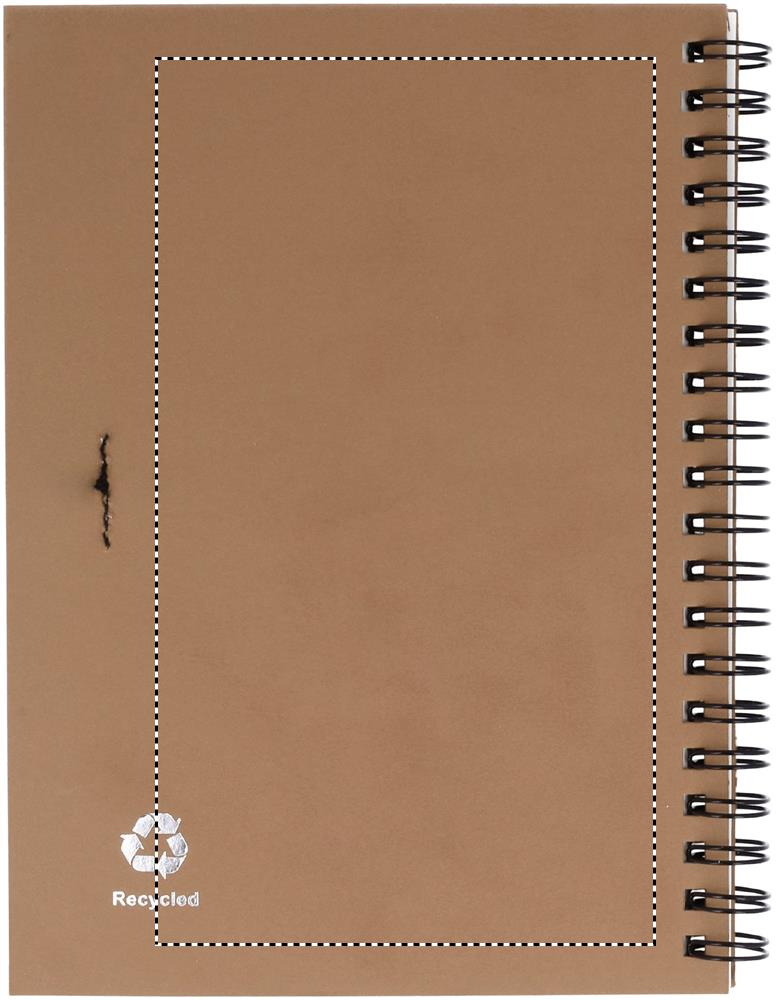 Taaskasutatud paberist märkmik pastakaga. Kahejuhtmeline. 140 tavalist taaskasutatud paberilehte (70 lehte). Nupuga pastapliiats taaskasutatud karbis ja biolagunevas plastis. Sinine tint. Must elastne pliiatsihoidja.