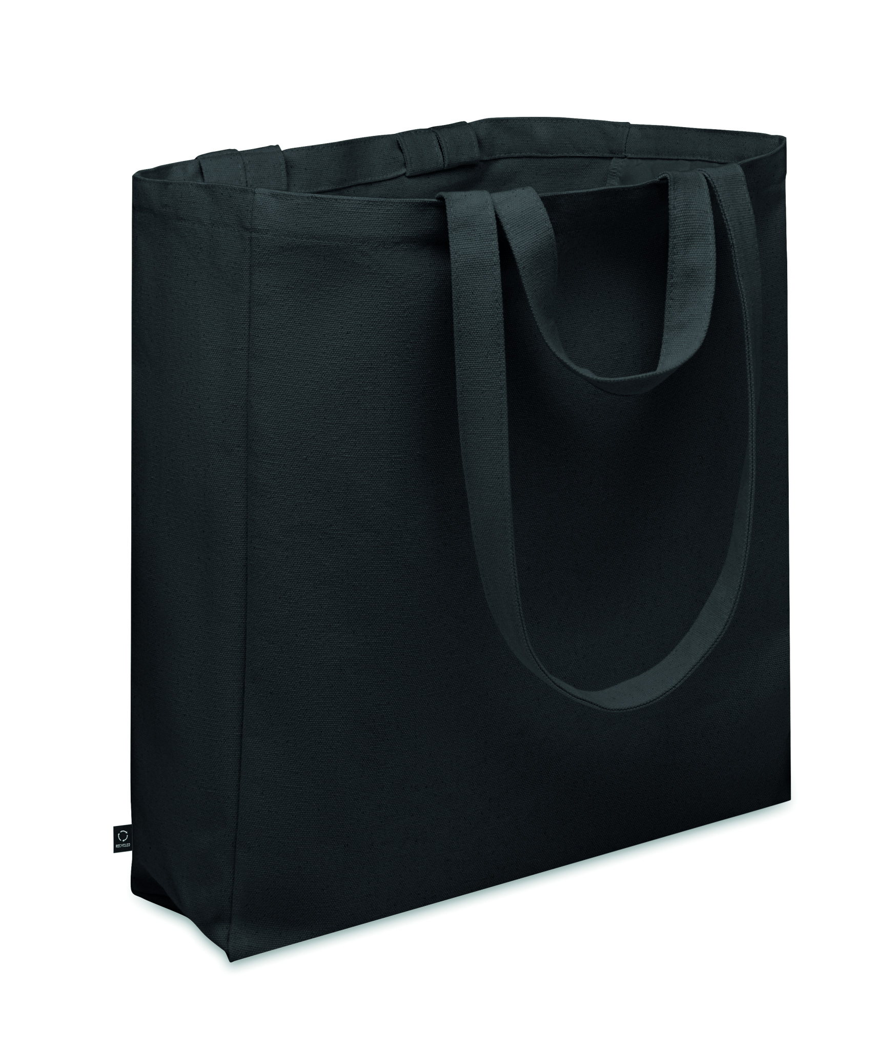 Must taaskasutatud polüpuuvillasest ostu- või rannakott (70% taaskasutatud puuvill, 30% taaskasutatud polüester) lühikeste ja pikkade sangadega. Sellel on külgmine lukuga tasku. 380 gr/m².
