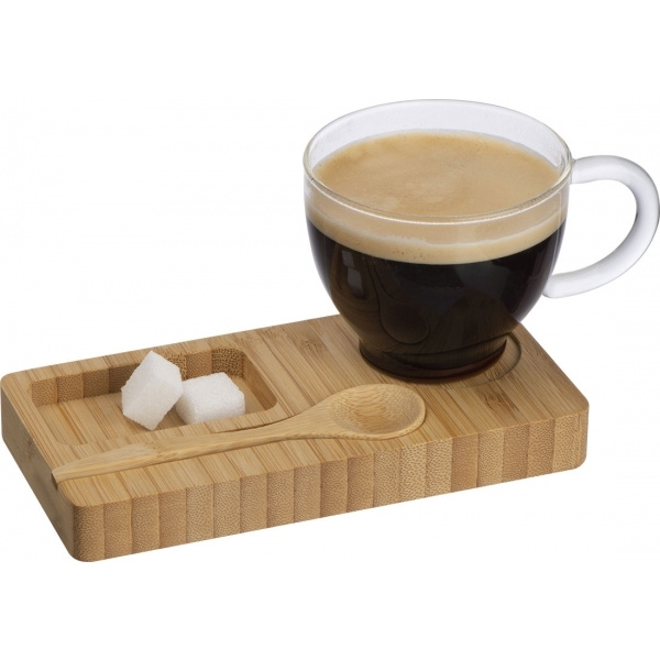 Bambusest alus bambuslusika, boorsilikaatklaasist kruusiga (150ml) ja pesaga suhkru või šokolaadi vms jaoks. Tahvlile graveeritakse teie logo.
