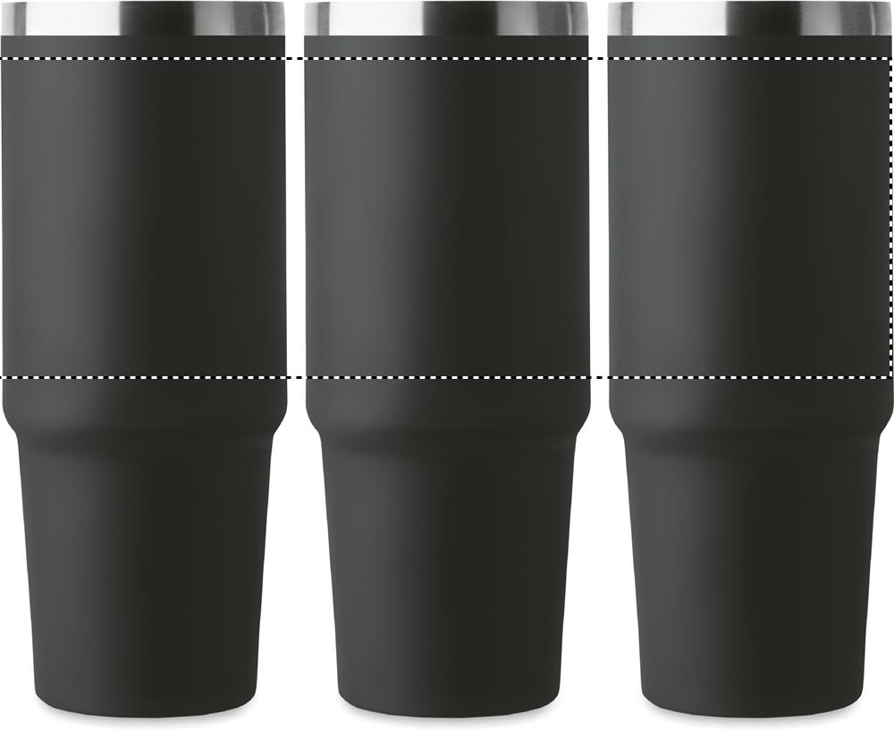 Kahekordse seinaga taaskasutatud roostevabast terasest (90% taaskasutatud roostevabast terasest ja 10% roostevabast terasest) trummel sisekõrrega kaanega, kokkupandav huulik ja otsene joogiava. Mahutavus 850 ml.