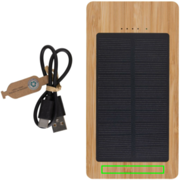FSC 100% bambusest valmistatud 10 000 mAh päikeseenergiapank. Powerbank kasutab kvaliteetseid monokristallilisi päikesepaneele, mille konversioonimäär on 19%. Tasu määr sõltub tingimustest. Akupank sisaldab kauakestvat A-klassi 10 000 mAh liitiumakut. Laadimiskiirus päikeseenergia: 5V/180mA. Sisendtüüp C: 5V/2A. Väljund: USB A: 5V/2A Tüüp C: 5V/2A. Toode ja tarvikud PVC-vaba. Kaasa arvatud RCS-sertifikaadiga taaskasutatud TPE laadimiskaabel. Pakitud FSC® segupakendisse.