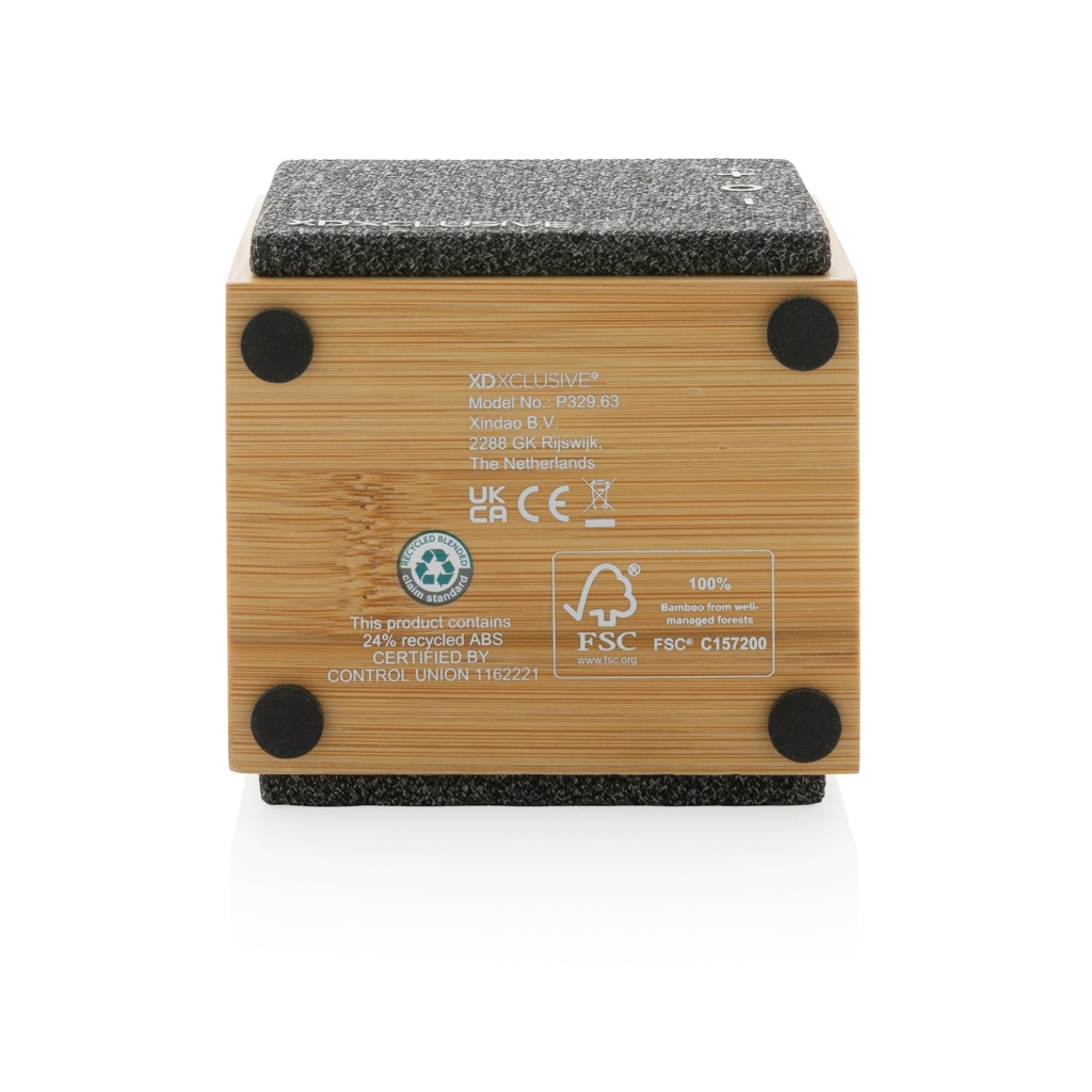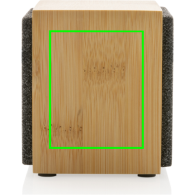 Luksuslik 5W kõlar selge heli ja tugeva bassiga. Väliskest on valmistatud FSC 100% sertifitseeritud bambusest. Plastosad on valmistatud RCS (Recycled Claim Standard) sertifitseeritud ringlussevõetud ABS-ist. Taaskasutatud kogusisaldus: 24% kauba kogukaalust. RCS-sertifikaat tagab taaskasutatud materjalide täielikult sertifitseeritud tarneahela. Kõlariga on kaasas BT 5.1, mis tagab lihtsa ja sujuva töö kuni 10 meetri kaugusel ning väikese energiatarbimise. 1200 mah aku võimaldab mängida kuni 6 tundi ja seda saab täielikult laadida 2 tunniga. Vastuvõtufunktsiooni ja mikrofoniga (video)kõnedele vastamiseks. Pakitud, kui FSC mix kraft kasti. Kaasa arvatud RCS-sertifikaadiga taaskasutatud TPE laadimiskaabel.