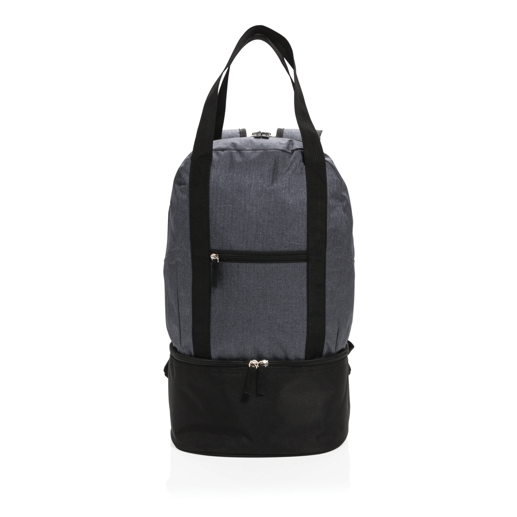 500D polyesterinen kaksivärinen reppu, jossa on pääosasto rantavarusteillesi ja pohjassa jäähdytinosasto, johon mahtuu jopa 8 tölkkiä. Helppo vaihtaa tote-kantolaukkuun hihnojen avulla.
