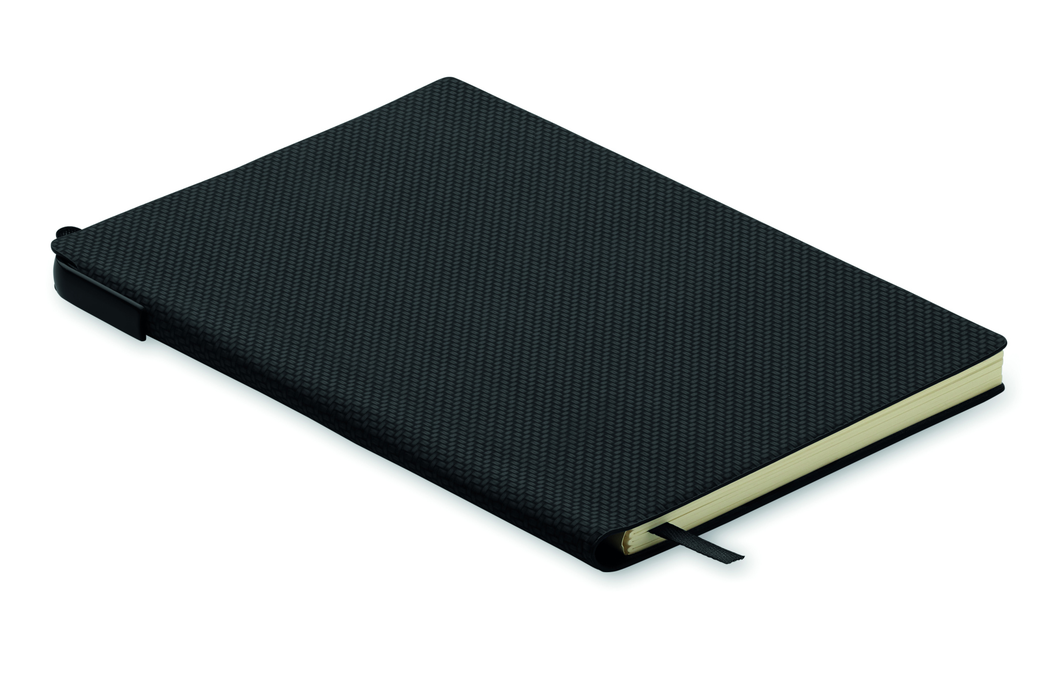 A5-kokoinen muistikirja strukturoidulla PU-kuorella ja ABS-kierrepallokynä selkä-kynäpidikkeen sisällä. Asia sidottu. 160 rivillistä sivua kierrätyspaperia (80 arkkia).