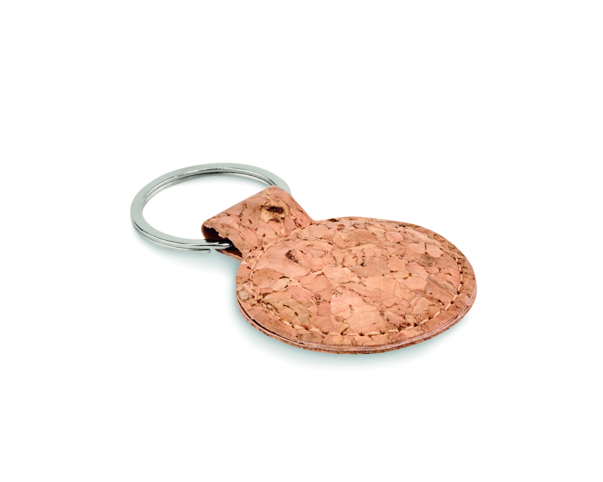 Pyöreä korkista tehty avaimenperä. Korkki on luonnonmateriaali, strukturaalinen laatu ja pinnan huokoisuus voi aiheuttaa eroavaisuuksia tuotteissa painatuksen jälkeen.