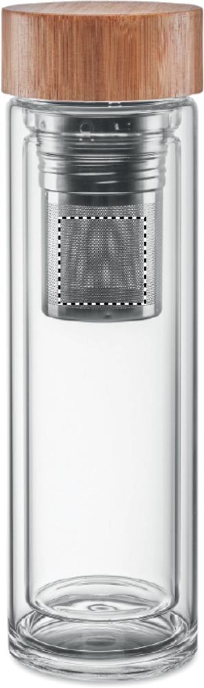 Kaksiseinäinen korkea 400 ml borosilikaattilasipullo ja bambukansi teesiivilällä. Luonnollisen materiaalin (bambu) vuoksi, tuotteiden värissä/ koossa saattaa olla erinäisyyksiä ja tämä voi vaikuttaa painatuksen lopputulokseen. Borosilikaattilasiin ei voi kaiverruttaa.
