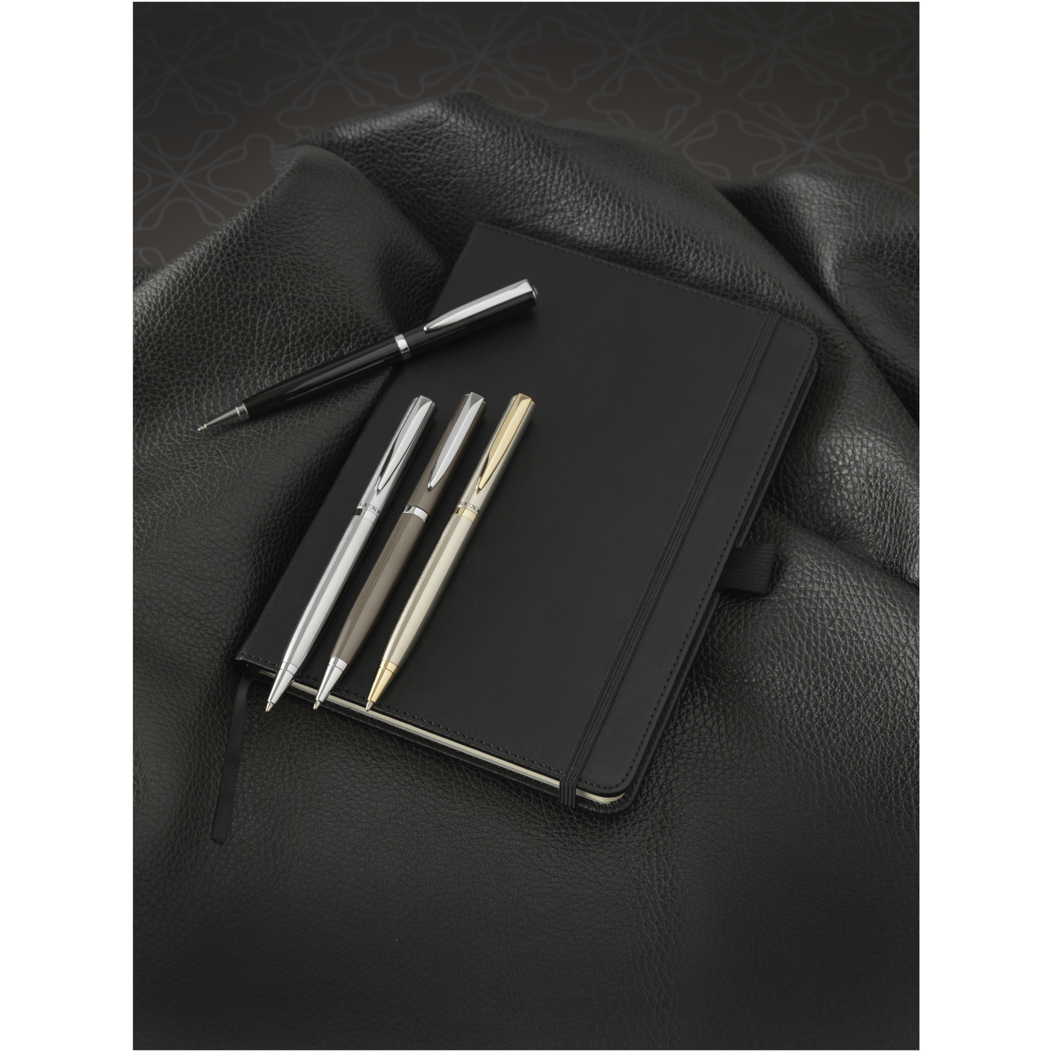 Tyylikäs muistikirja (A5-koko) jossa on 80gsm, 80 arkkia kermanväristä viivallista paperia sisäosan mustalla taskulla ja kynäsilmukalla. Pakattu ''LUXE''-lahjapakkaukseen.