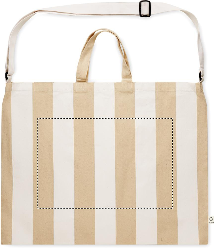 Erittäin suuri raidallinen rantalaukku 280 g/m² kierrätettyä puuvillaa (80%) ja kierrätettyä polyesteriä (20%), sisätasku. Lyhyet kahvat ja yksi iso säädettävä olkahihna.