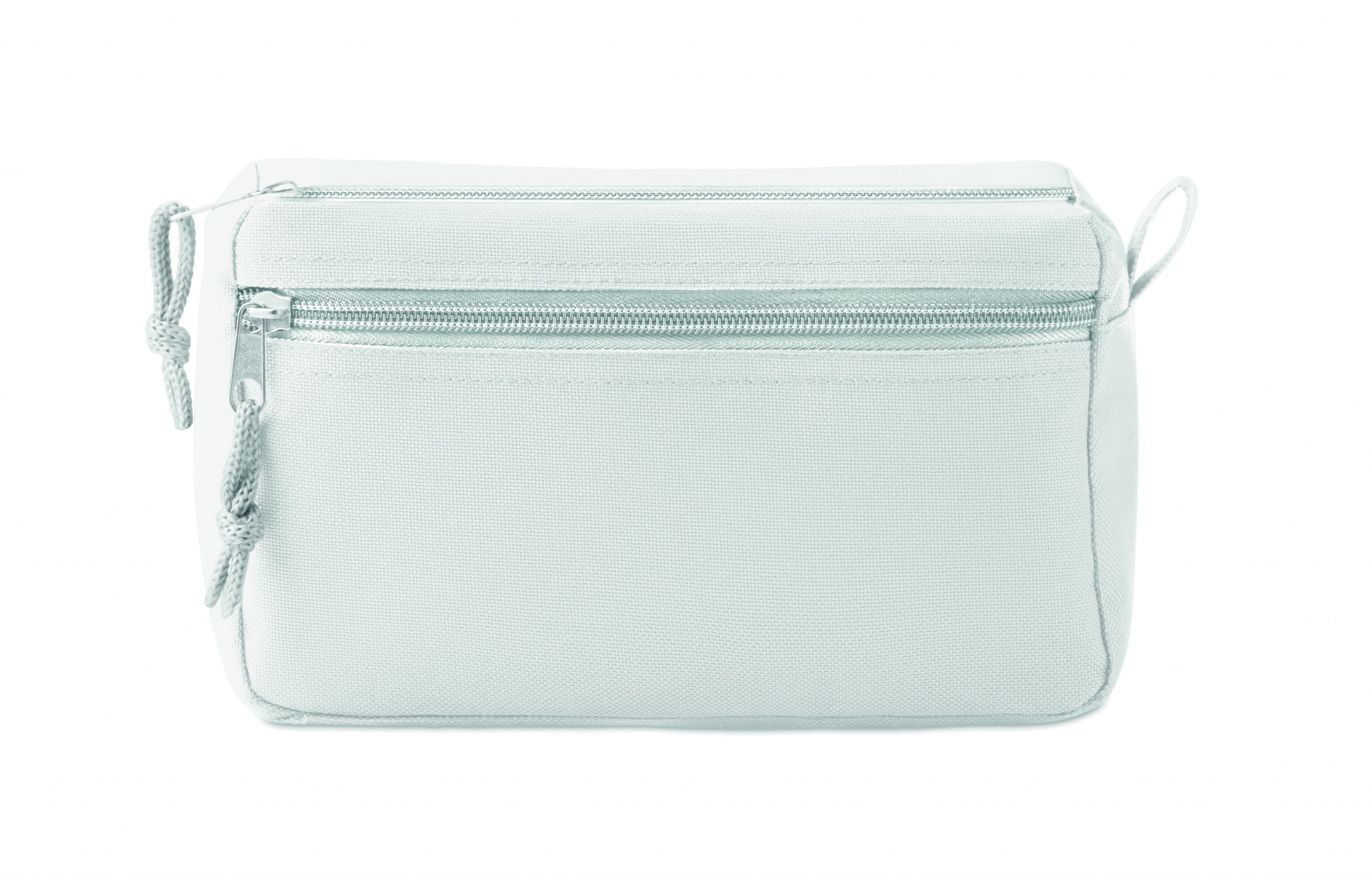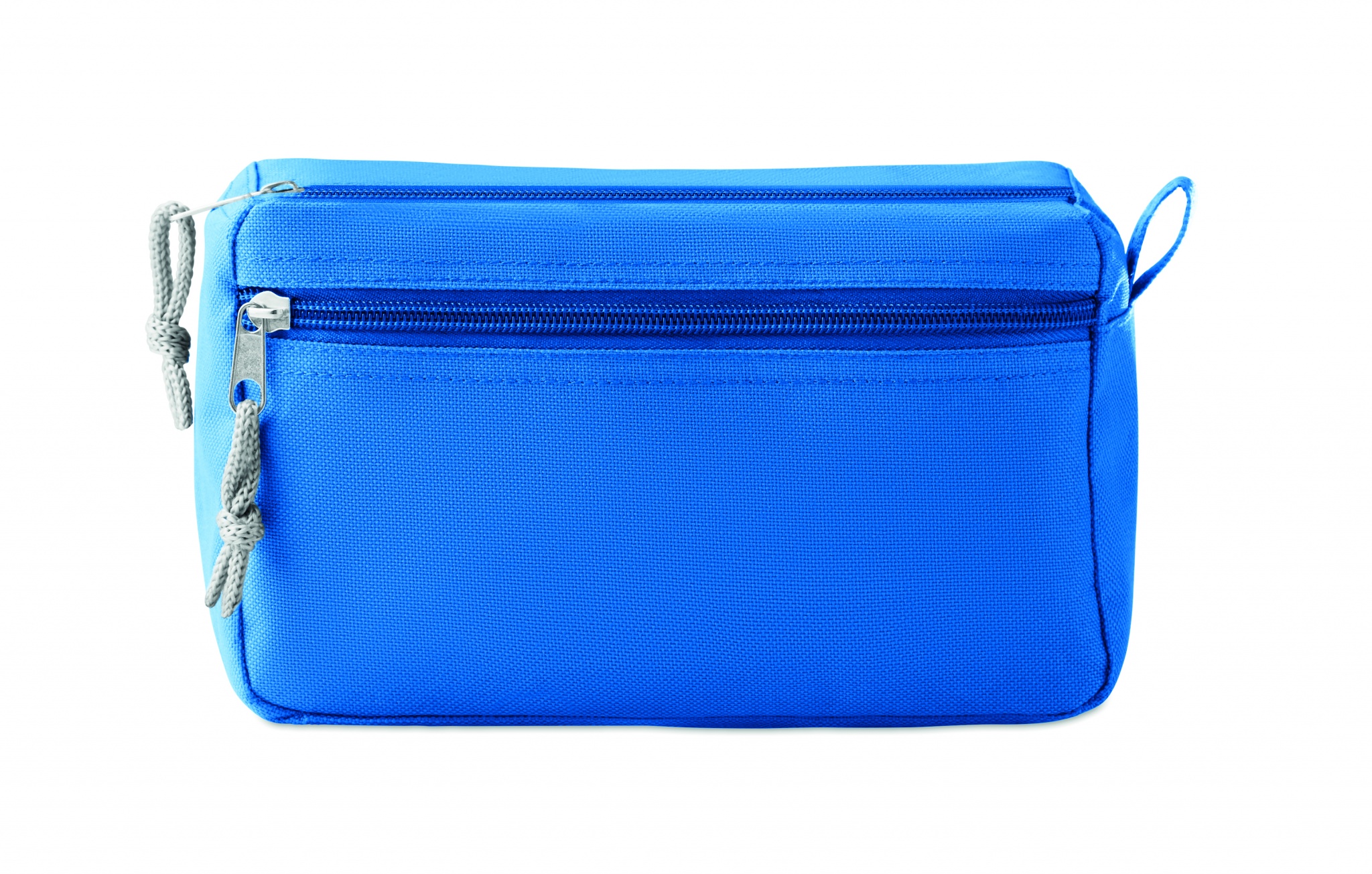 600D- polyesterinen kosmetiikkalaukku PPE-taustalla, kahdella vetoketjullisella taskulla.