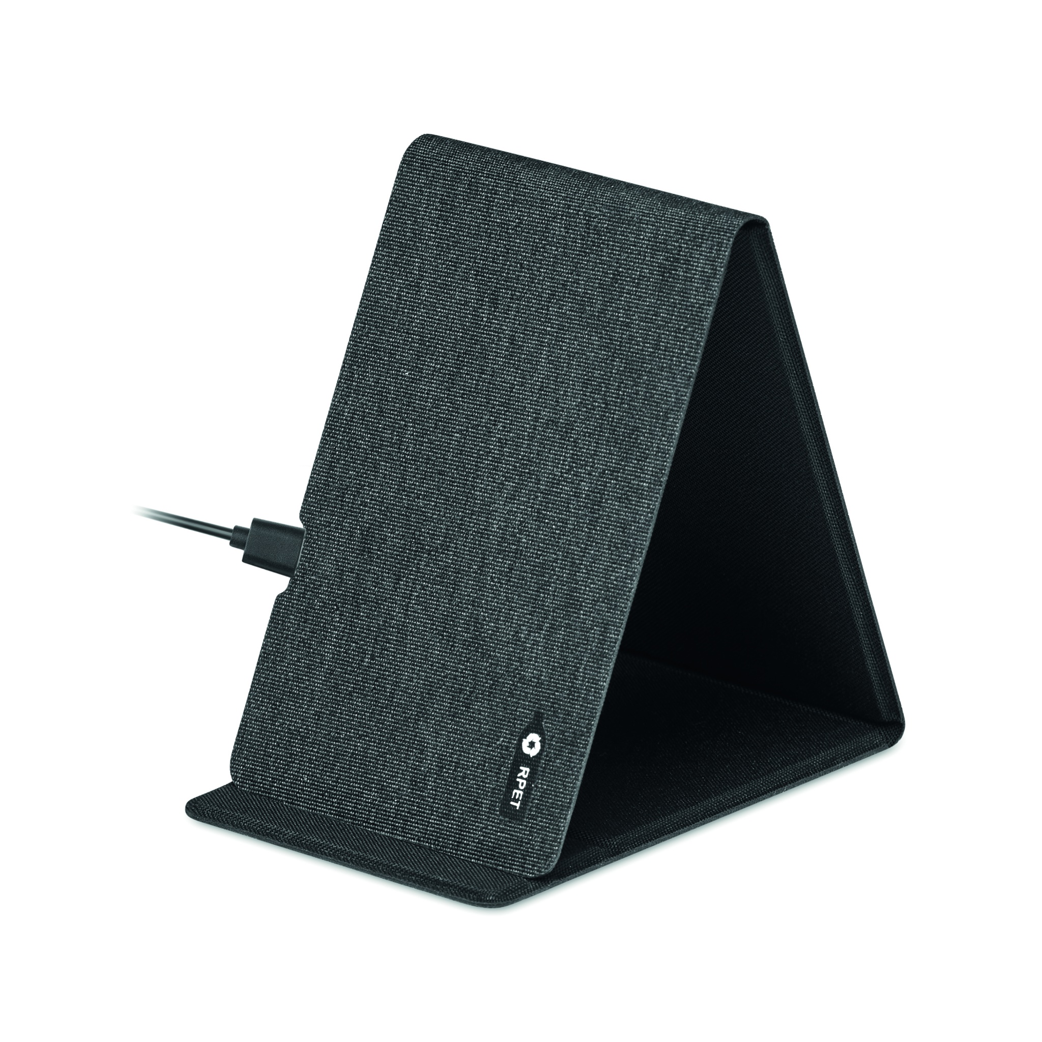 RPET 300D kaksi sävyinen langaton laturi/ puhelinpidike, lähtövirta 9V/1.6A (15W) Yhdistä laturi tietokoneeseen ja aseta älypuhelin alustalle aloittaaksesi latauksen. Yhteensopiva android, iphone8, X ja uusimpien laitteiden kanssa.