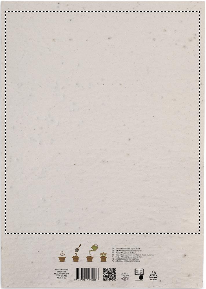 Niittykukkien siemeniä kierrätyspaperista valmistetussa A4 arkissa (80 gr/m²). Valmistettu EU:ssa.