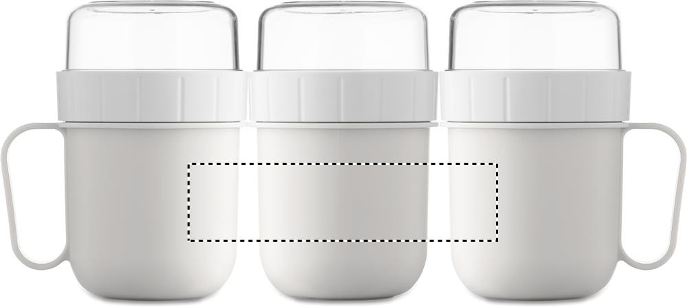 Aamiaista tai brunssia mukaan otettavaksi tarkoitettu kuppi PP- ja PS-korkissa. Sisältää kaksi erillistä rasiaa, jotka pitävät ainekset erillään. Tilavuus: 450 ml ja 160 ml. Vuotamaton.