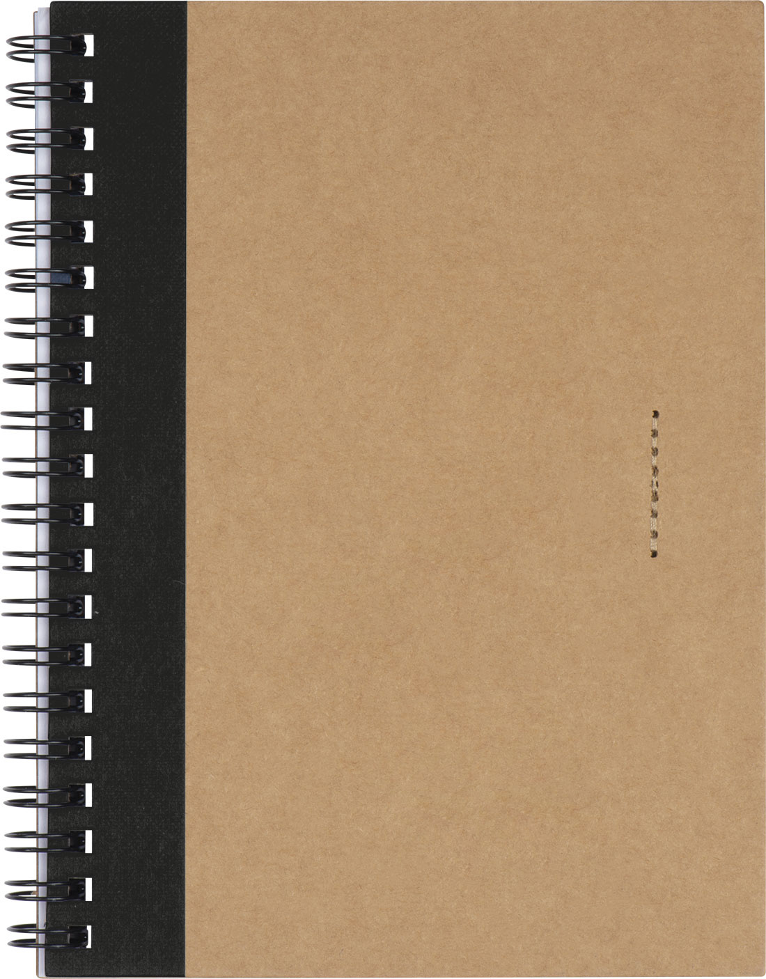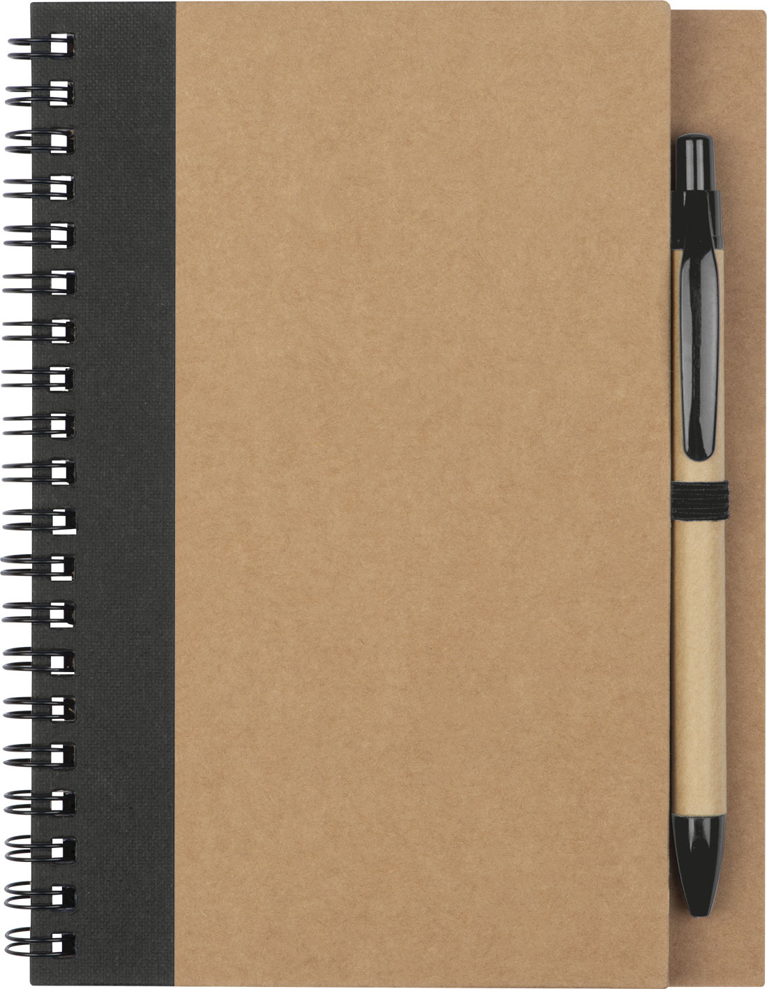 Kierresidottu vihko, jossa on 120 kierrätyspaperista valmistettua tyhjää sivua (kansi 250 gsm, sivut 60 gsm) ja kynälenkki. Mukana tulee kierrätyspaperista valmistettu kuulakärkikynä, jossa on ei-vaihdettava sinikirjoitustäyttö ja ABS-muovikoroste.