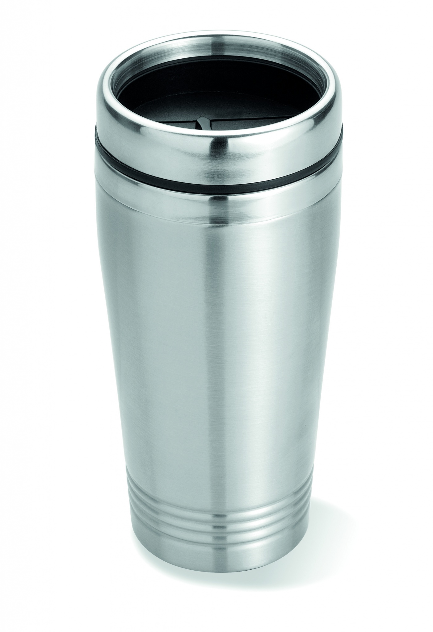 Kaksiseinäinen ruostumattomasta teräksestä valmistettu 400 ml termosmuki, mustalla PP- muovi kannella.