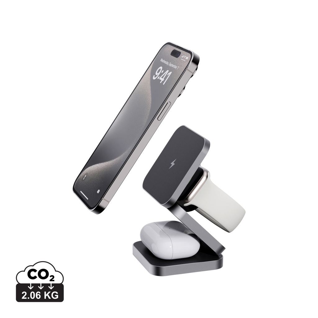 Ylellinen ja kokoontaitettava 3-in-1 langaton laturi, joka on valmistettu RCS-kierrätetystä ABS muovista ja RCS-kierrätetystä alumiinista. Kokonaiskierrätetty sisältö: 46 % tuotteen kokonaispainosta. RCS-sertifiointi takaa täysin sertifioidun toimitusketjun kierrätysmateriaaleille. Langattomassa laturissa on magneettinen 15 W:n langaton laturi ja ylimääräinen 5 W:n langaton laturi, joka sopii kuulokekoteloihin tai muihin pieniin langattomasti ladattaviin laitteisiin, sekä 2,5 W:n langaton laturi älykelloille (vain Apple-kellot). Mukana RCS-sertifioitu 120 cm kierrätetty TPE-kaapeli. Pakattu FSC® mix kraft -pakkaukseen. Tuote ja tarvikkeet 100 % PVC-vapaita. Syöttö: 1: 9V/3A optimaaliseen käyttöön. Lähtö: Puhelin: 9V/1.1A; 9V/1.67 A/(15W), Kuulokkeet: 9V/1.67 A/(15W): 5V/1A (5W), kello: 5V/0.5A. PVC-vapaa.