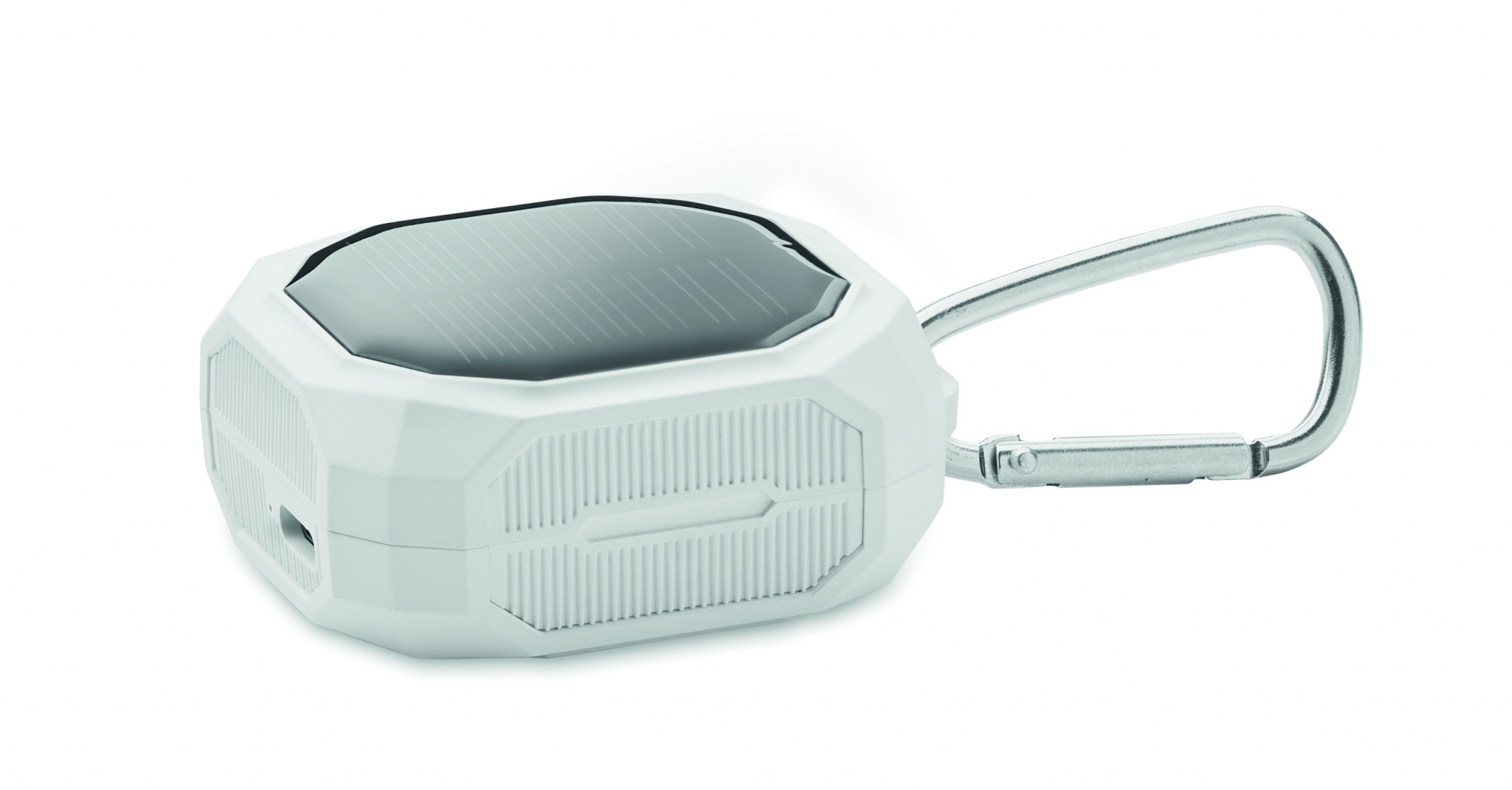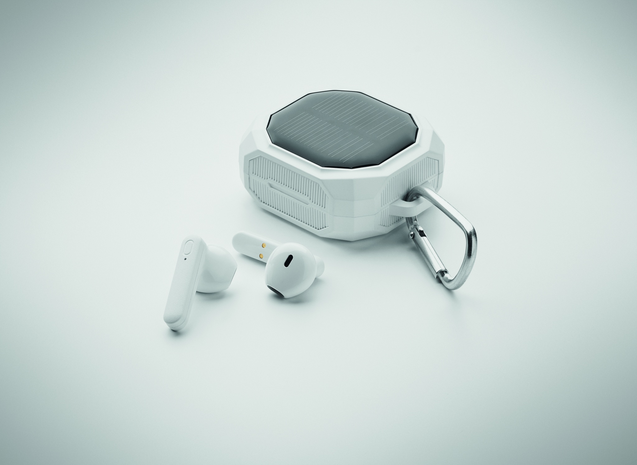 ABS True Wireless Stereo (TWS) 5.3 langattomat kuulokkeet, joissa on mikrofoni ja karabiini. 30 mAh akku. Soittoaika n. 4 tuntia. Aurinkokennolaturi. Automaattinen pariliitäntä. Mukana C-tyypin latauskaapeli ja 200 mAh latausasema.