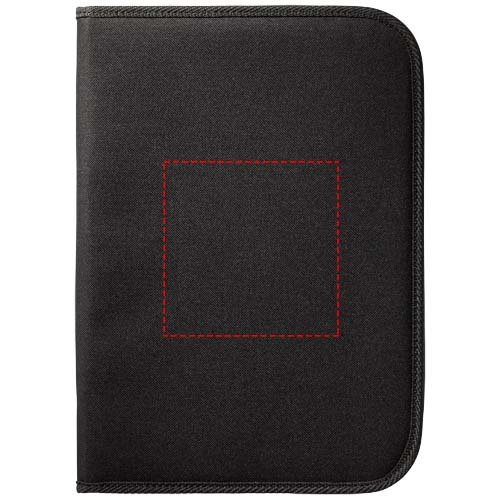 Kansiossa on vetoketju, kynälenkki, asiakirjataskut ja 20 viivoitettua muistipaperia. Kynä ja tarvikkeet rekvisiittaa.