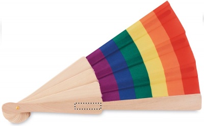 Manuaalinen polyesteeristä valmistettu satenkaaren värein koristeltu viuhka. Luonnollisen materiaalin vuoksi, tuotteiden värissä/ koossa saattaa olla erinäisyyksiä ja tämä voi vaikuttaa painatuksen lopputulokseen.